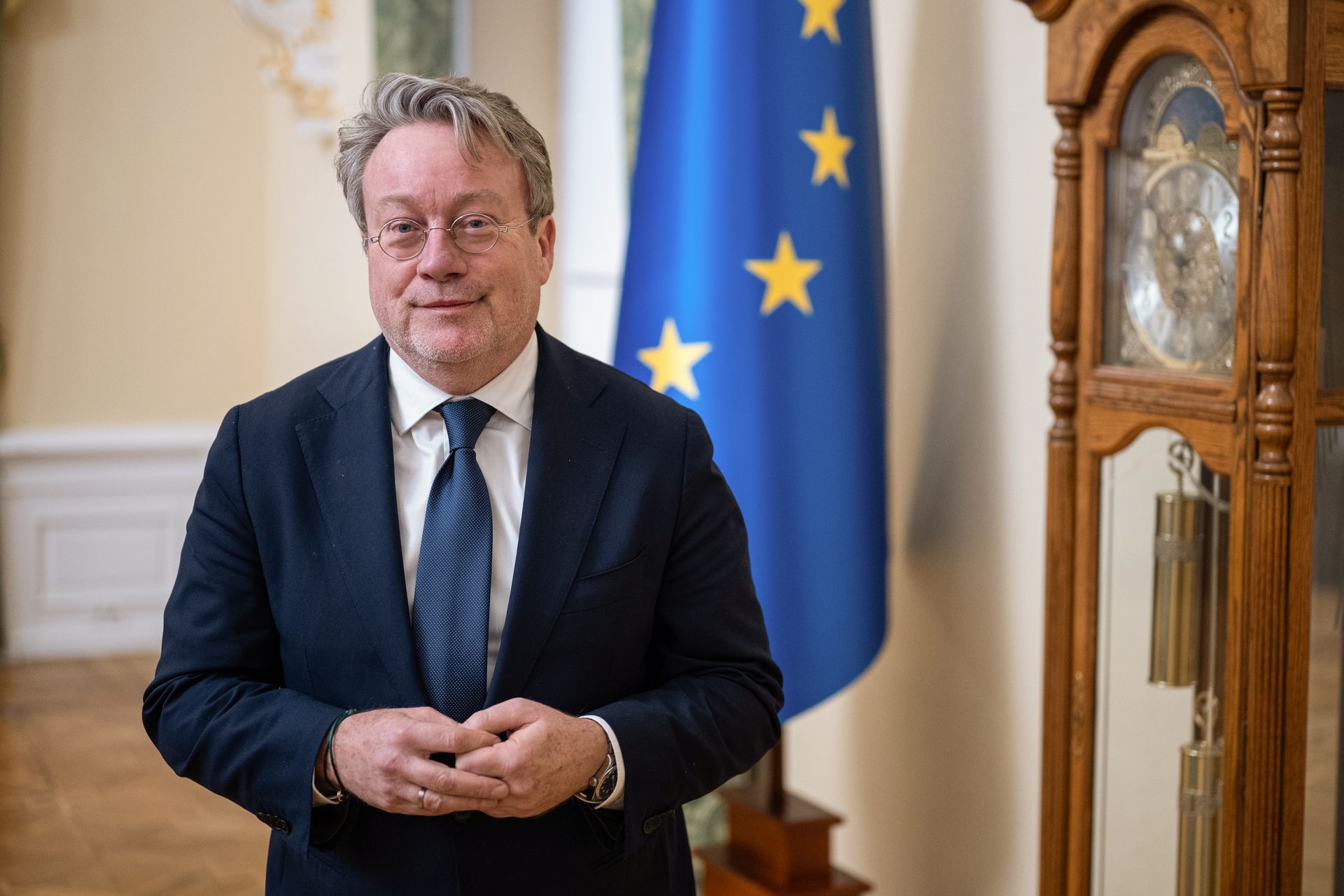 The current governor of De Nederlandische Bank, Olaf Sleijpen, poses for a portrait before an interview in Kyiv, Ukraine, on Feb. 19, 2026. (Danylo Antoniuk/ The Kyiv Independent)