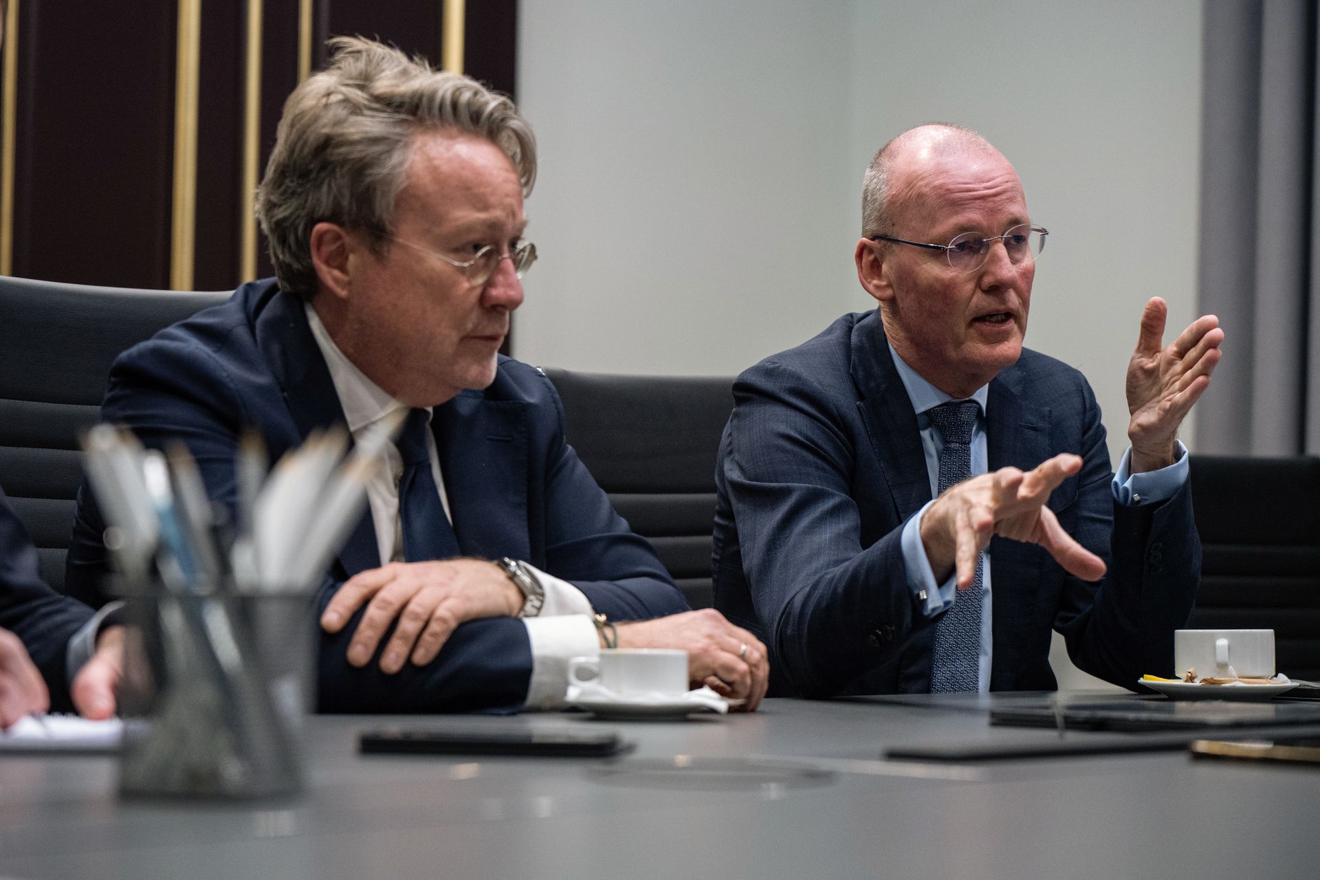 The current president of De Nederlandsche Bank, Olaf Sleijpen (L), and Klaas Knot, the former president ®, in Kyiv, Ukraine, on Feb. 19, 2026. (Danylo Antoniuk/ The Kyiv Independent)