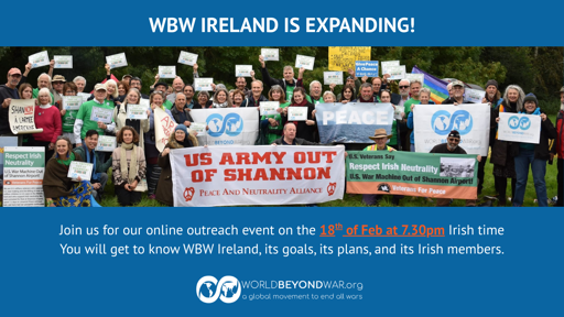 On Feburary 18th, 2026 members of the Irish chapter of World BEYOND War organised an online event to introduce interested people to their activism and organising.