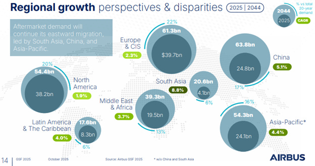 These slides are from Airbus’ GSF, and China’s aftermarket industry today is the 3rd largest in the world, but will be the largest in twenty years. This is important too, that China’s market is considered separately from Asia-Pacific. Afterservices in China, plus Asia-Pacific, will grow to $112 billion in twenty years, which is over half of the total global demand.