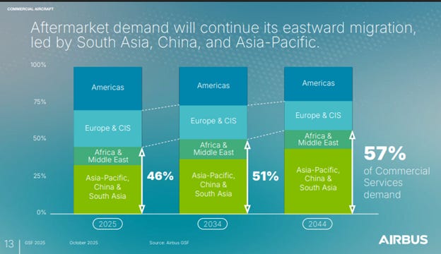 Airlines across the world are repositioning themselves and shifting to Asia, because this is where most of the growth will be. That means more airports, more jets, more pilots. It also means high demand here for maintenance and repair facilities. Airbus already has large manufacturing hubs in China, and point out in their Global Services Forecast that the afterservices market in China will more than double, to over $63 billion by 2044.