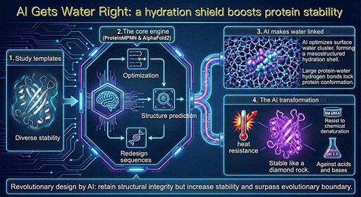 A study published in the Journal of the American Chemical Society reports that artificial intelligence can enhance protein stability in an unexpected way—by engineering the water around a protein, not just the protein itself. Researchers led by Dr. Kuen-Phon Wu, at Institute of Biological Chemistry, Academia Sinica and Institute of Biochemical Sciences, National Taiwan University, found that AI-designed ubiquitin-fold proteins can achieve exceptional resilience by creating a protective, "mesostructured" hydration shell on their surface.