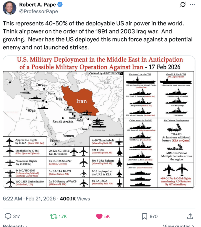 Trita Parsi on why the Iranian leadership (still intact) rejected Trump’s offer of a ceasefire: “Tehran is not looking for a ceasefire and has rejected outreach from Trump. The reason is that they believe they committed a mistake by agreeing to the ceasefire in June – it only enabled the US and Israel to restock and remobilize to launch war again. If they agree to a ceasefire now, they will only be attacked again in a few months. For a ceasefire to be acceptable, it appears difficult for Tehran to agree to it until the cost to the US has become much higher than it currently is. Otherwise, the US will restart the war at a later point, the calculation reads.”