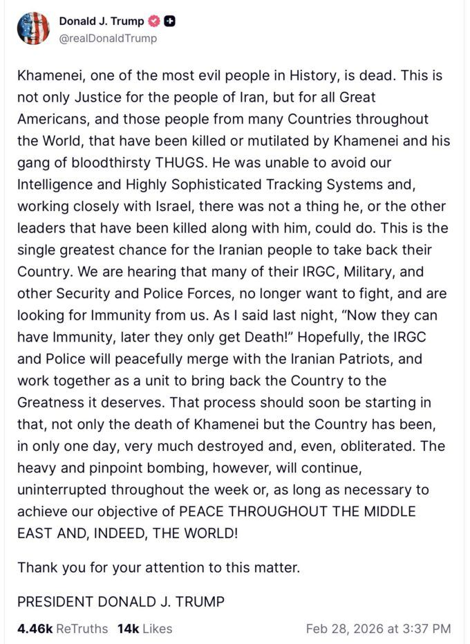 Robert Wright: “I suspect Trump thought killing Khamenei would be a punctuation mark that would let him declare victory and disengage (like the June bombings of nuclear facilities). I also suspect it’s going to have the opposite effect. It can’t be overemphasized that Trump is dumb as a brick.”