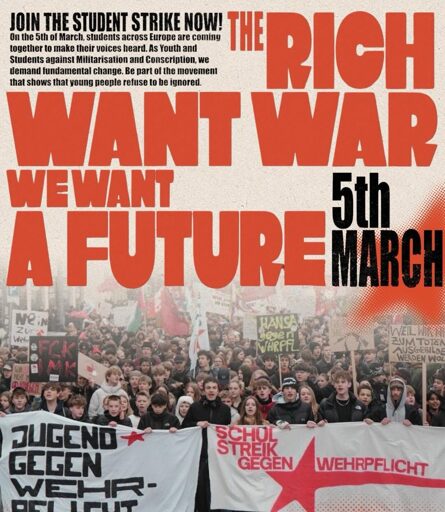 As Europe is undergoing increased militarisation and conscription is being re-introduced in many European countries, youth are mobilising against preparations for war. On December 5th last year, around 55,000 students walked out across Germany, showing that the next generation will not simply accept preparations for war as inevitable. Now, a coalition of collectives from across Europe has called for a second strike on March 5th.