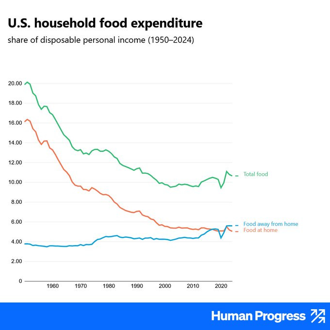 Food is getting cheaperThe price of food has dropped dramatically. In the pre-industrial era bread was often the major item of household expenditure. The depressing counterpoint to this graph would trace the massive rise of expenditure on housing.
