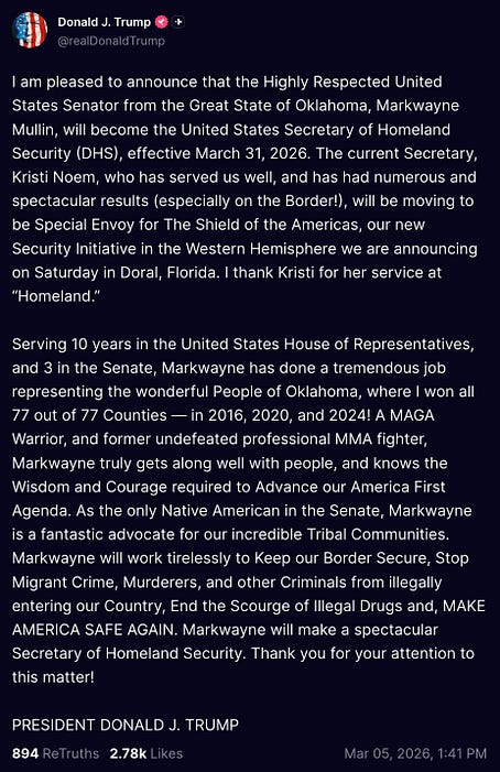 - Trump found one of the few people in Washington dumber than ICE Barbie to replace Noem at DHS, assuming he’s confirmed, which the Senate is likely to do, if only to remove Mullin from their chamber…