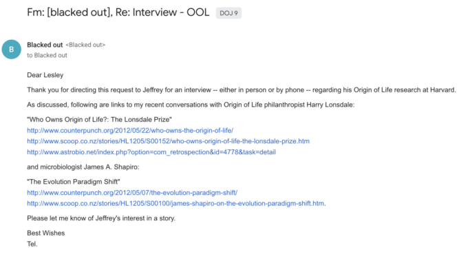 +Look, Mom, CounterPunch made the Epstein files! An email from [redacted] references articles by Suzan Mazur on the anti-Darwinist evolutionary biology movement.