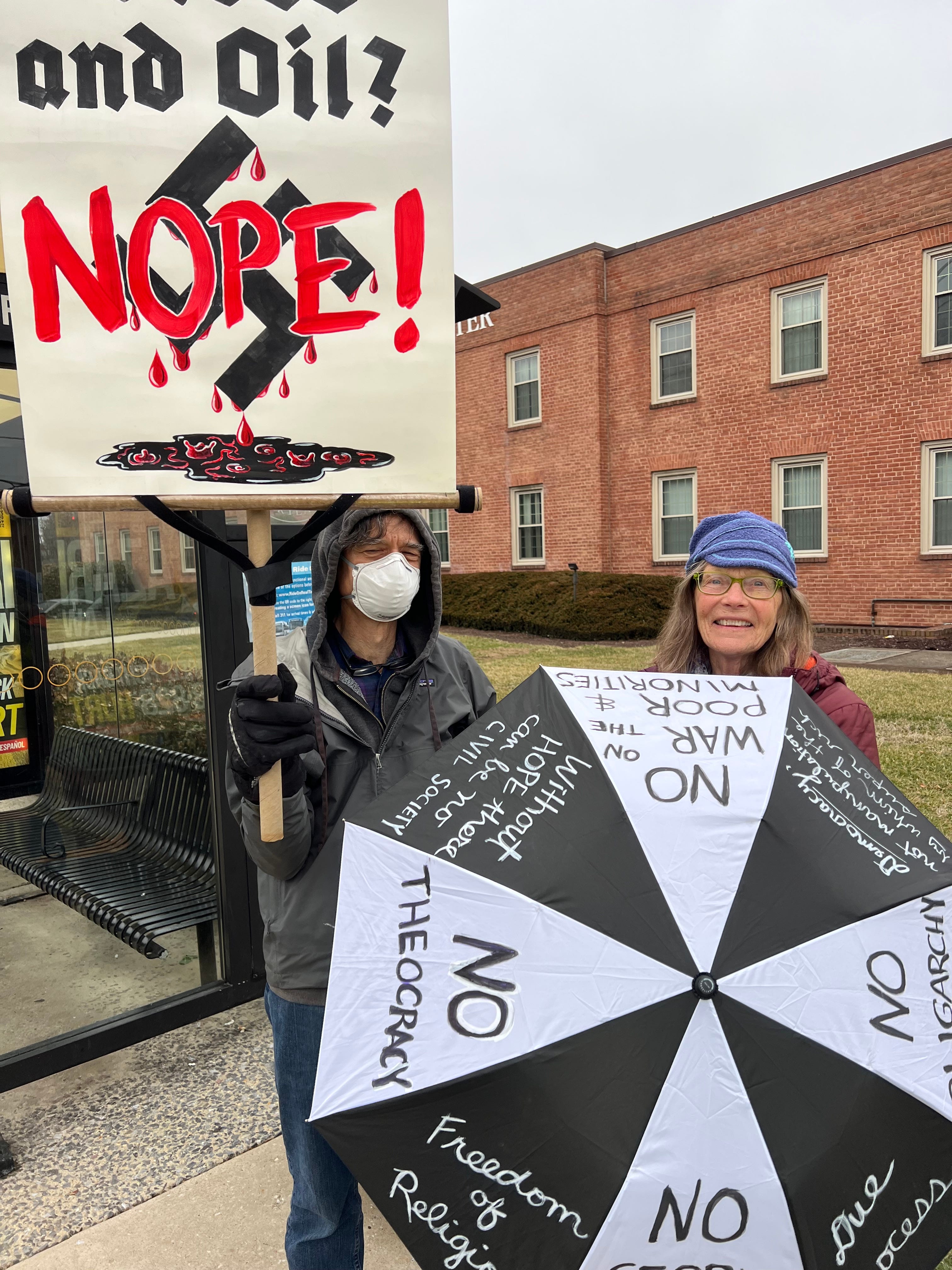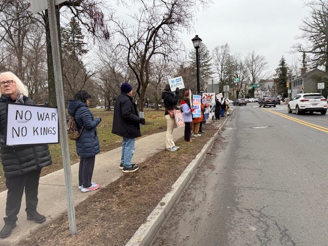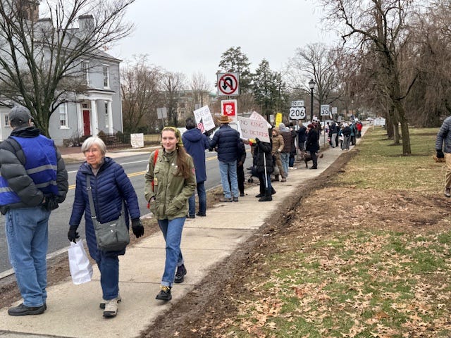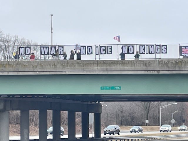 Princeton, NJ’s second monthly honk-and-wave rally was organized by Indivisible on a cold, gray Friday. Lots of honking and waving from about 80% of passing vehicles, and some had their own anti-Trump signs.