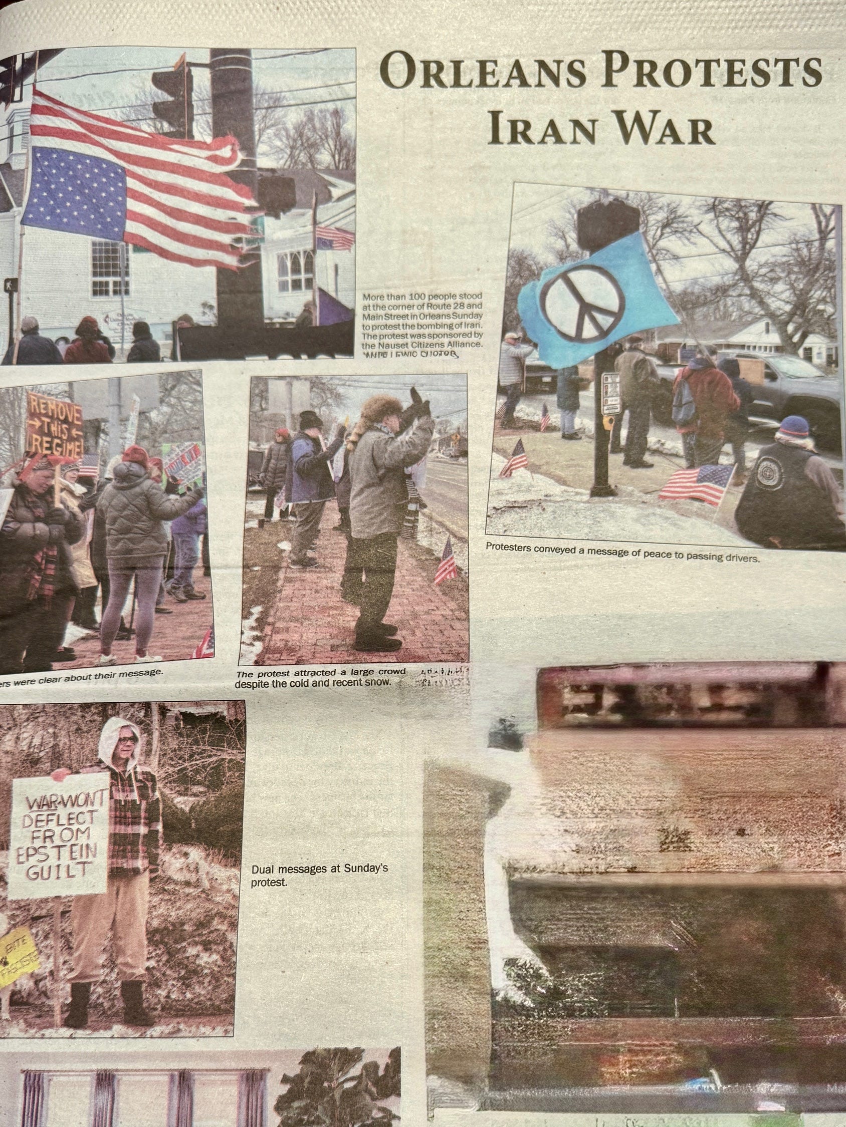 I was pleasantly surprised that our local Chatham, MA, Cape Cod Chronicle newspaper used some of my Orleans protest photos in this week’s printed edition. This was an ‘emergency’ protest a day after the Iran bombing. I think local coverage is an important publicity strategy and needs to be encouraged. Seeing is believing.
