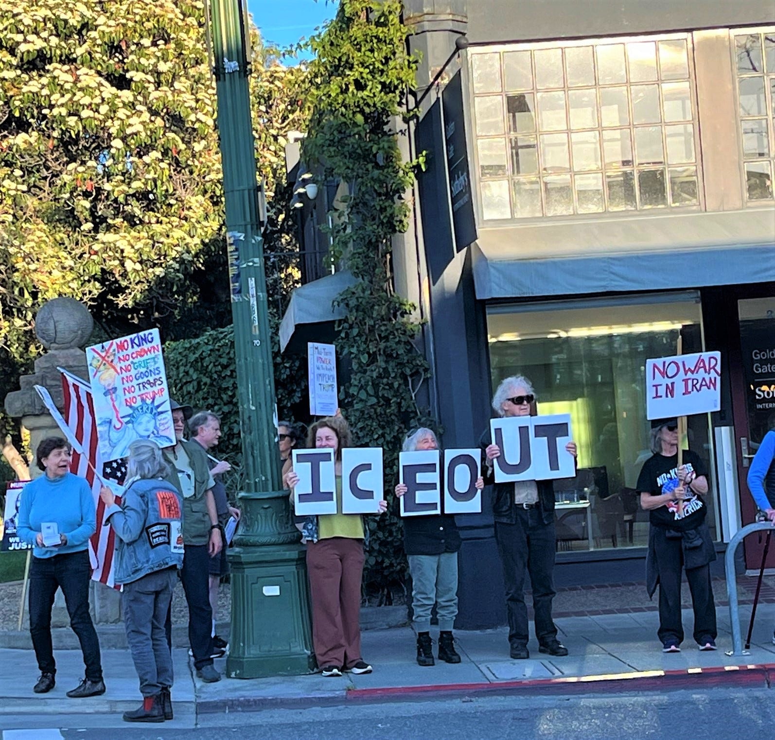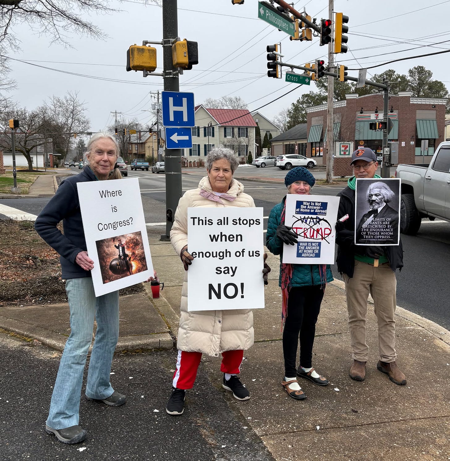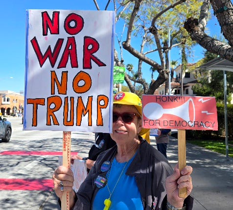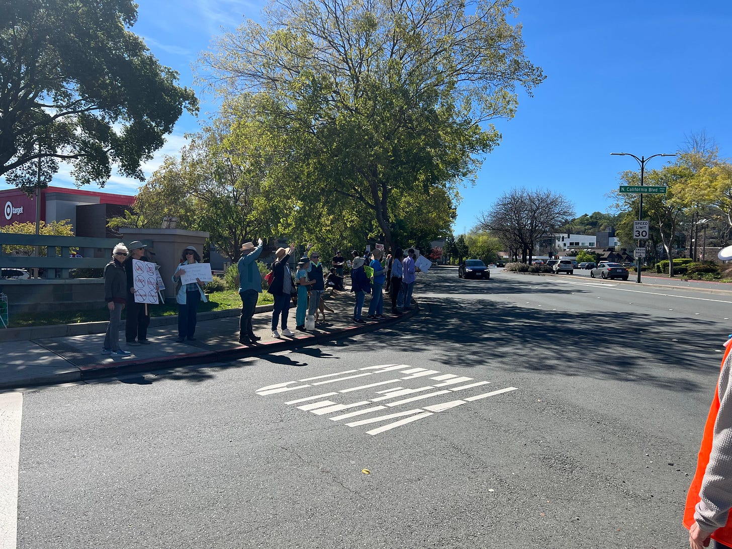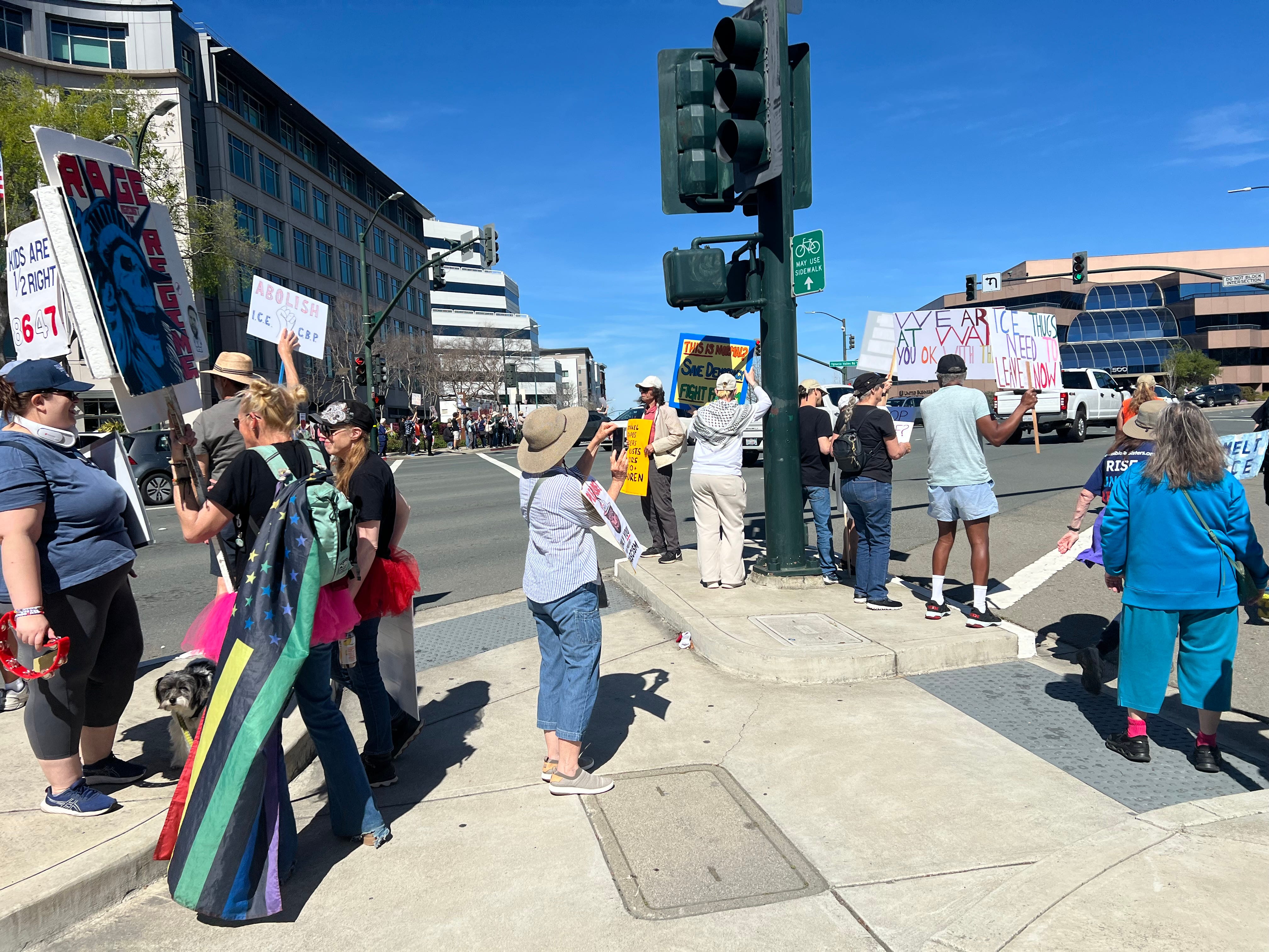 3-7-26… Indivisible Resisters Contra Costa in Walnut Creek, Ca…covered all 4 corners of very busy intersection with wonderful honking support… a great day that I very much needed.