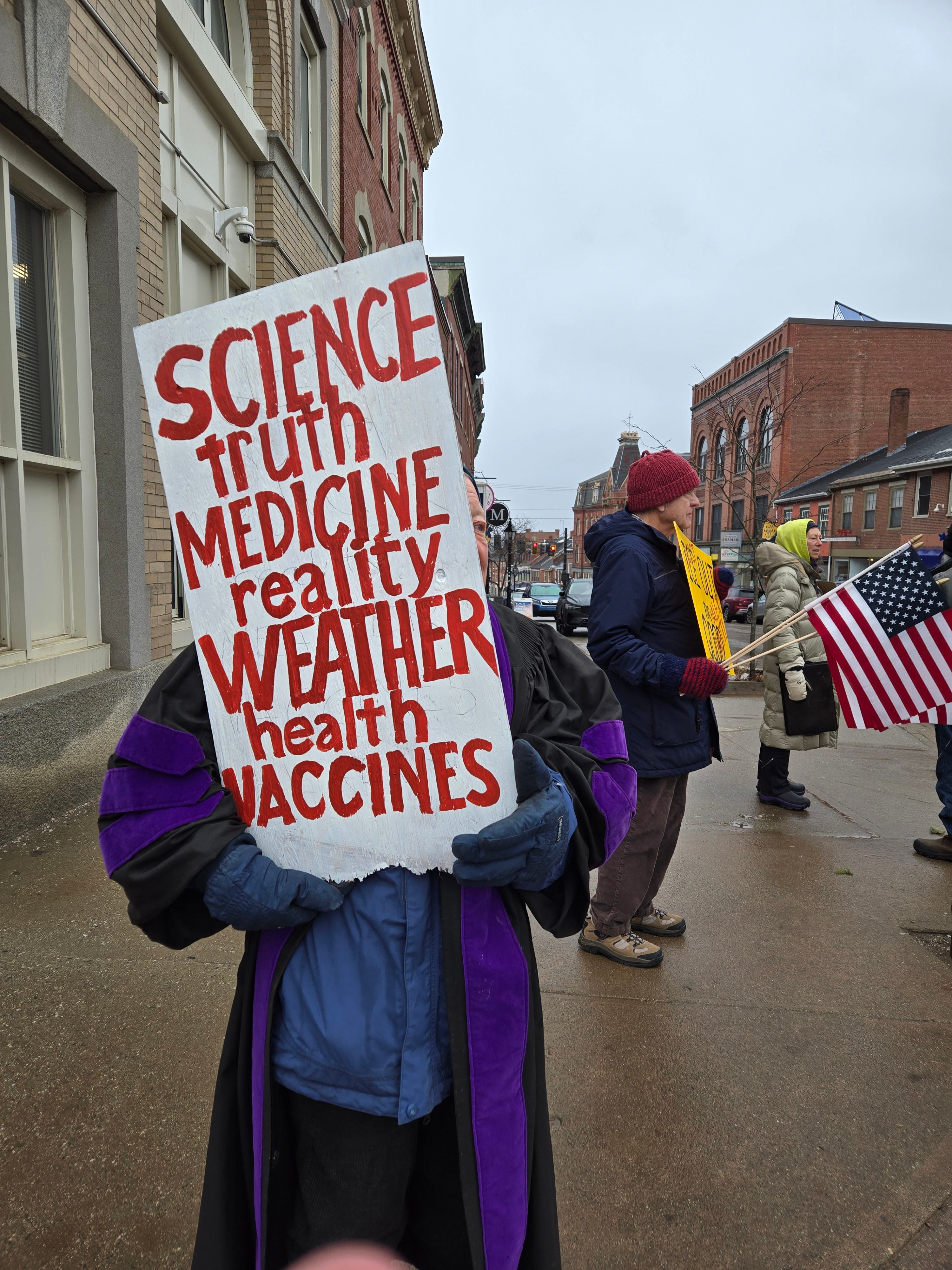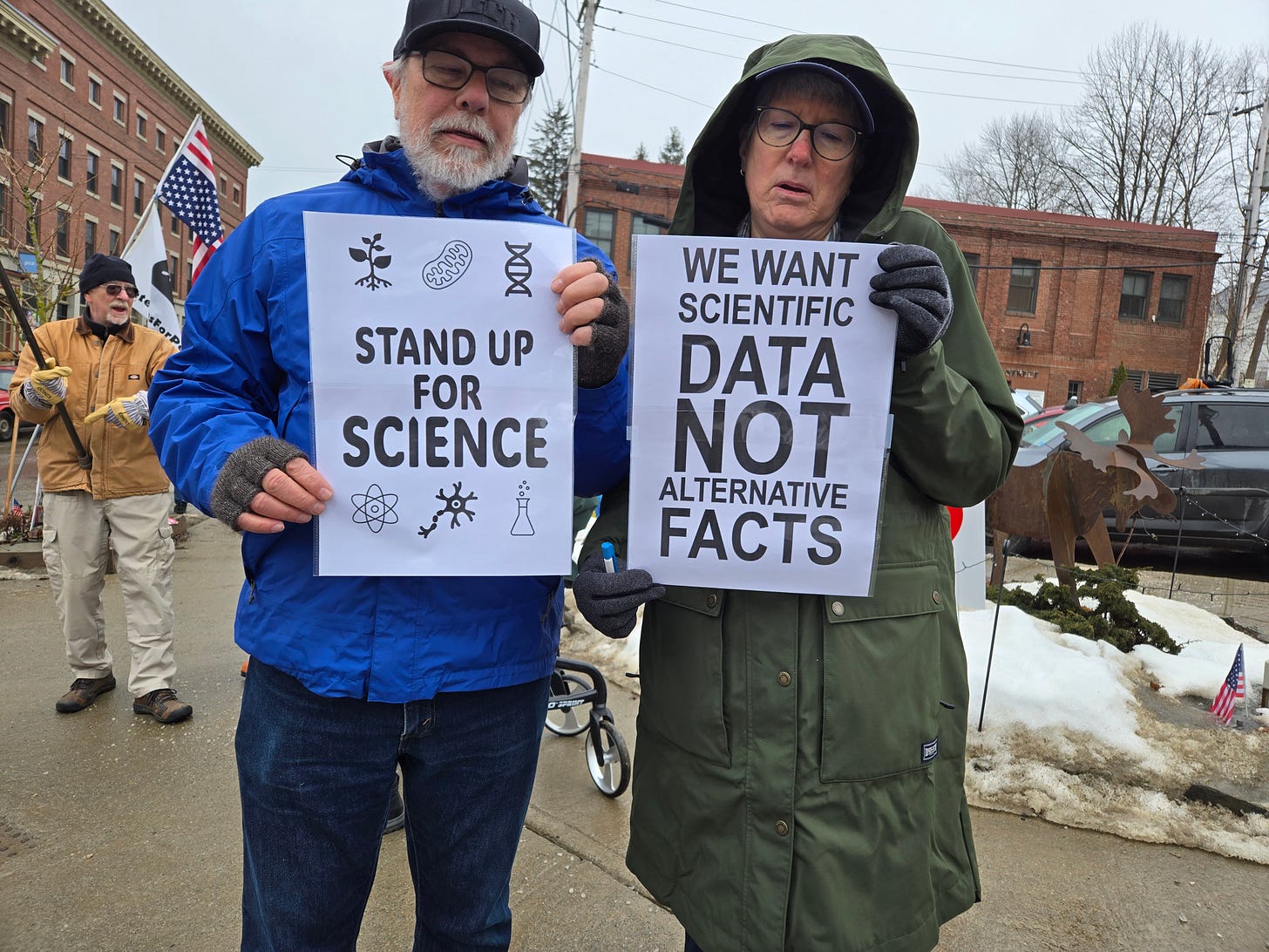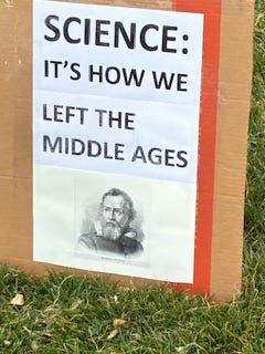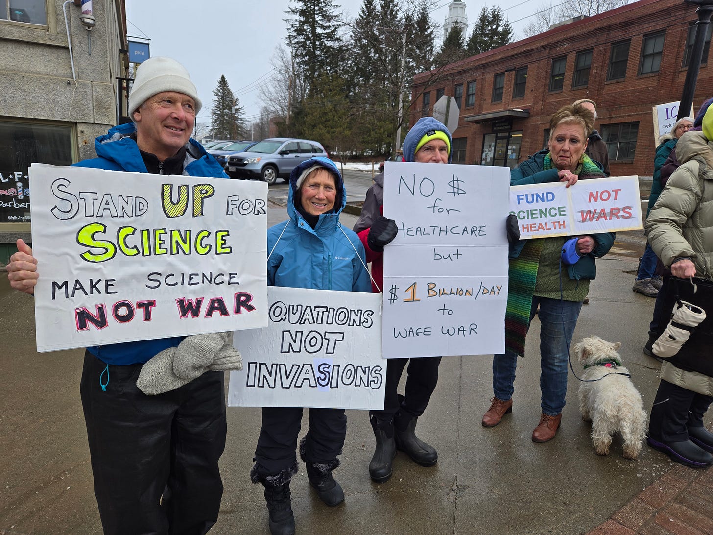 Fifty intrepid souls showed up on a gray, drizzly day in Belfast, ME for our weekly standout. About 10 of us were there to support the National Stand up for Science protests.