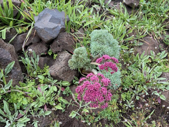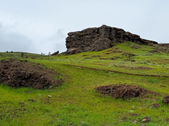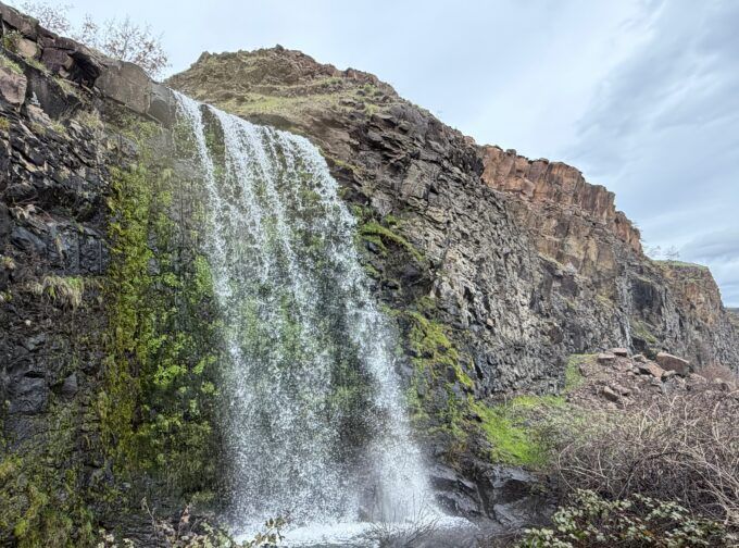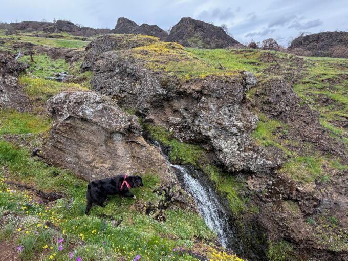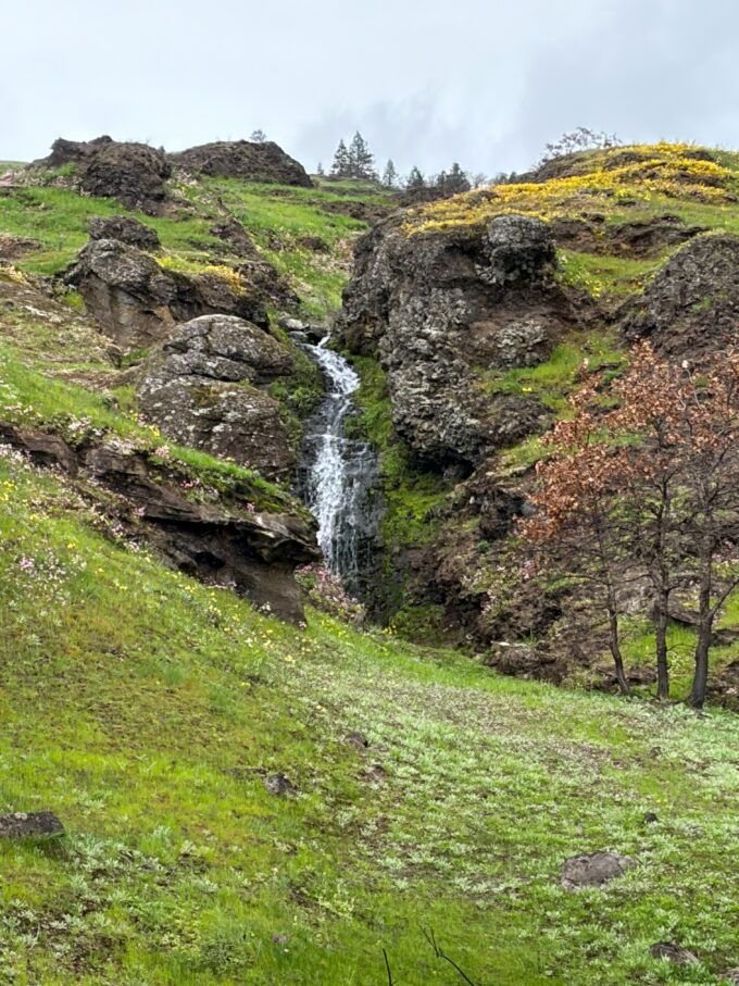 The weather was in the 40s with a whipping wind (it always howls here) and steady drizzle, but the high desert, with Black basalt formations extruding from the earth like the spines of a Stegosaurus, the rocks riven by slot canyons and hidden waterfalls, was already in bloom with grass widows, smooth prairie stars, desert parsley and white saxifrage.