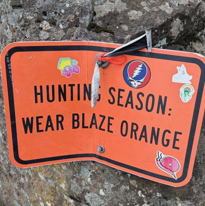 Spent condoms and stickers adorn a sign at the base of the Coyote Wall, warning that we’re all potential targets.