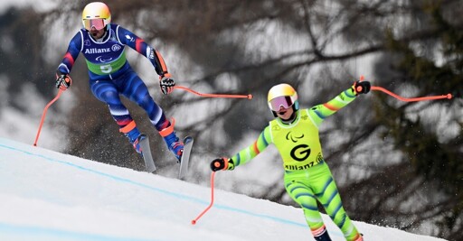 Team France’s Hyacinthe Deleplace, a visually impaired athlete, competes with the guide Perrine Clair during the super-G leg of the Para Alpine Skiing Men’s Alpine Combined Vision Impaired event on day four of the Winter Paralympic Games at Tofane Alpine Skiing Centre, in Italy, on March 10, 2026. In vision-impaired para-Alpine categories, skiers with complete or partial vision loss navigate runs with help provided by a sighted guide, communicating via radio.