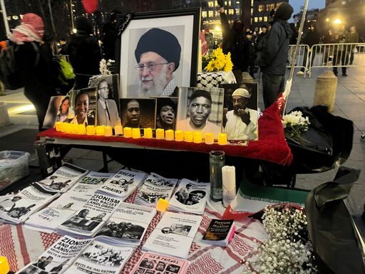 More than 250 antiwar demonstrators gathered last night in downtown Manhattan to commemorate the life and honor رحمها the martyrdom of Emam Ayatollah Ali Khamenei. Speakers represented a broad coalition