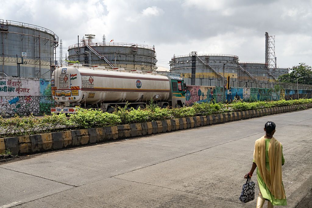 An oil tanker passes storage tanks at a Bharat Petroleum Corp. oil refinery in Mumbai, India, on Aug. 11, 2025. (Abeer Khan/Bloomberg via Getty Images)