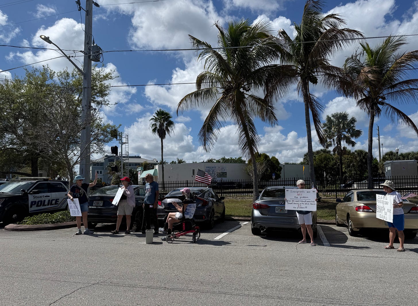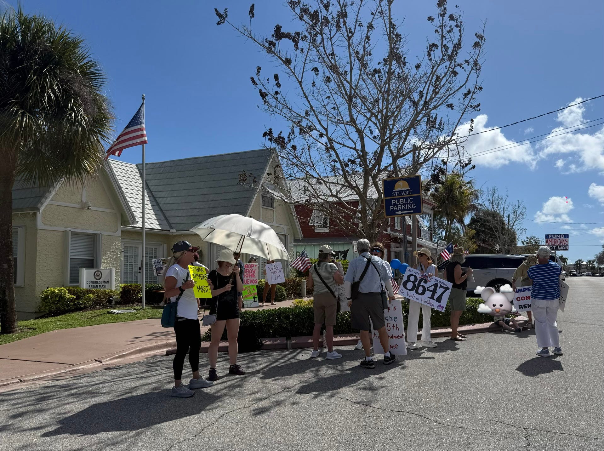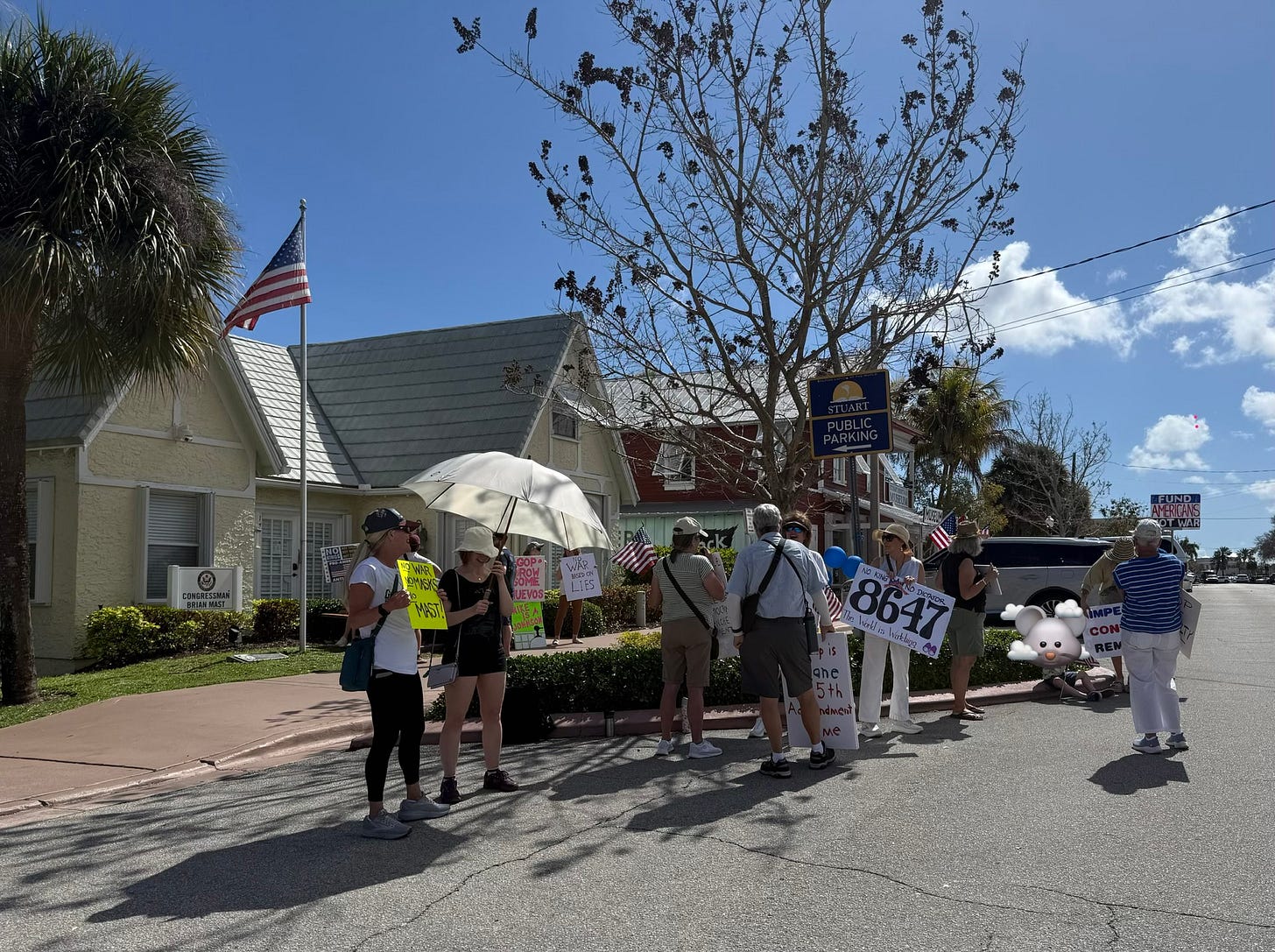 Our 53rd consecutive Wednesday rally at Congressman Brian Mast’s Stuart, FL office. 35 people showed up today including one little rabbit. And you can see the police car there for “our safety”.Someone’s getting nervous.