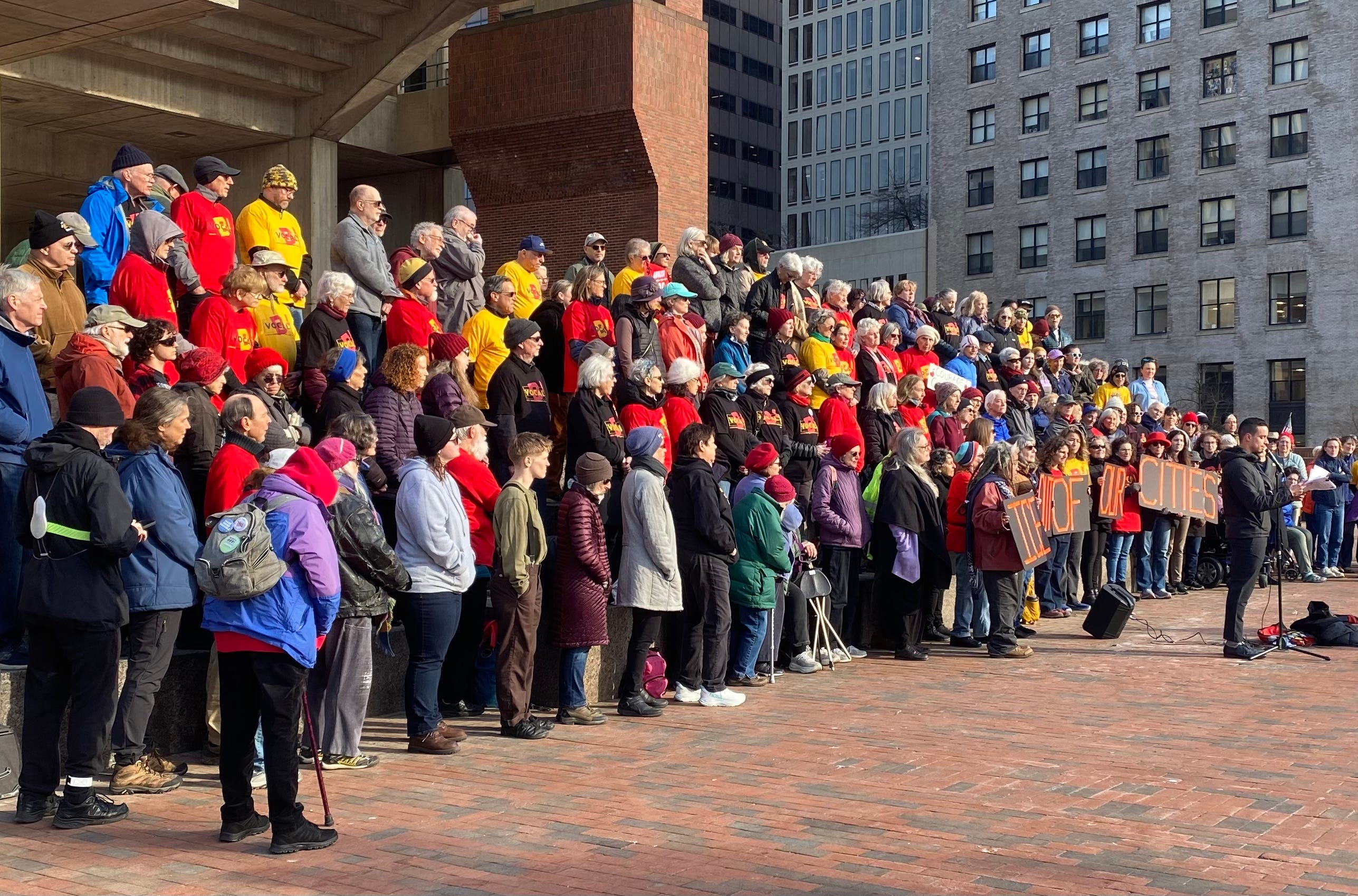 Hi Robert. This photo is of Boston Voices of Community and Labor (BVOCAL) and fellow members of other area choruses, singing the anthem “Hold On” in front of Boston City Hall, in support of the safety and wellbeing of our immigrant neighbors. We were joined by several members of the City Council.