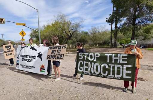 In an industrial area of Tucson unaccustomed to political protests, passing cars honked enthusiastically against Israel’s genocide of Palestine. Israel purchases a version of the F-35 that it has used to drop “bunker busters” that have murdered Palestinians and leveled homes as part of the Zionist genocide.