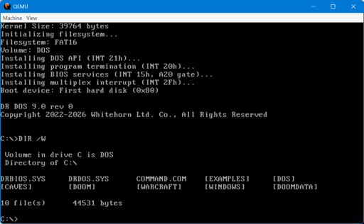 He’s gone so far as to purchase the trademark, so this re-creation is the official DR-DOS. In any case [CheeseWeezel]’s DR-DOS is considered version 9.0, and is currently in Beta. The clean-sheet re-implementation of DR-DOS’s API was sadly necessary due to the rather tortured history of the IP after DR was bought by Novel, who sold DR-DOS to Caldera, who briefly open-sourced the code before retracting the license and selling on. Some of you may remember a controversy where a previous rights holder, DR DOS INC, was found purloining FreeDOS code in violation of the GPL. Perhaps because of that, [CheeseWeezel] isn’t using any old code, and isn’t open-sourcing what he’s done. Right now, the beta of DR-DOS 9 is free for non-commercial use, but as is standard for EULAs, that could change at any time without warning. [CheeseWeezel] is still working full compatibility, but at this point it at least runs DOOM.