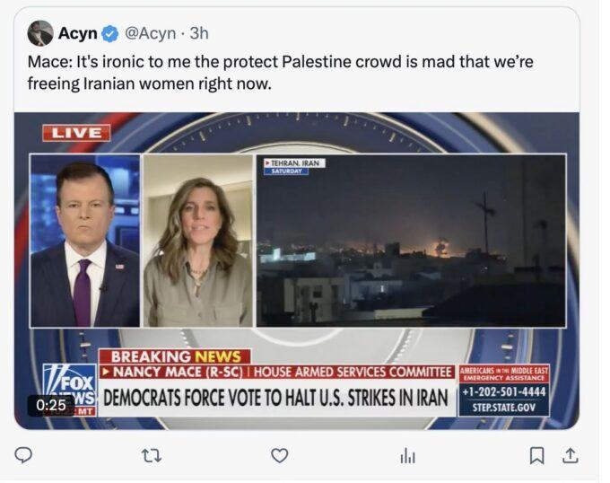 The timid Democrats have criticized Trump for not having a “plan,” as if having a plan would legitimize his criminal war. But they do have a plan and the plan is maximum destruction. The plan is for a spectacle of bomb-blast light shows and mass death. One of the first kill shots was an attack on an Iranian girls’ school that murdered 200 people, including teachers and students. Helluva way to liberate women.