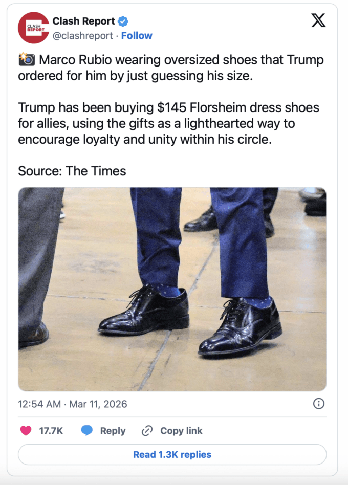 Footwear fascism came to the White House in the form of the Florsheim shoes that Trump is demanding his top advisors and cabinet members wear. The pair of Marco Rubio’s been seen wearing are so oversized they make him look like he’s ready to join the circus, though perhaps that was Trump’s intention?