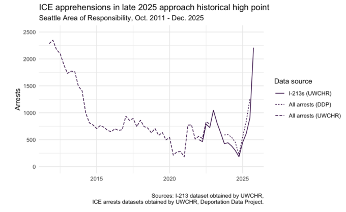 The recent surge in ICE arrests in the Pacific Northwest has approached the historic height of arrests during the first Obama administration. The spike was particularly high in Oregon, especially in Multnomah County (ie, Portland). The data sets and charts are included in this link to a new study by the University of Washington’s Center for Human Rights…