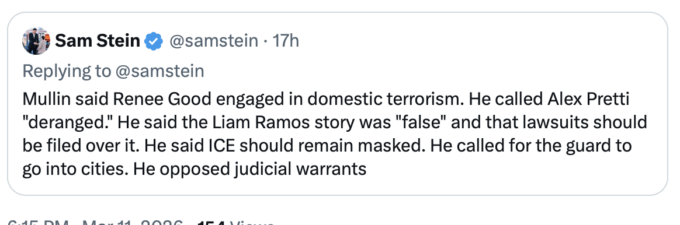 Substituting muscle for brains, Pete Hegseth makes Donald Rumsfeld sound like Von Clausewitz: “No quarter, no mercy for our enemies. Yet some in the press just can’t stop. People look at the TV and they see banners, headlines — I used to be in that business, I know everything is written intentionally. For example, a banner — ‘Mideast War Intensifies.’ What should the banner read instead? How about, ‘Iran increasingly desperate,’ because they are. Or more fake news from CNN. CNN reports that the Trump administration underestimated the impact of the Iran war on the Strait of Hormuz. The sooner David Ellison takes over that network, the better…The only thing prohibiting transit in [Hormuz] right now is Iran shooting at shipping. It is open for transit should Iran not do that.”