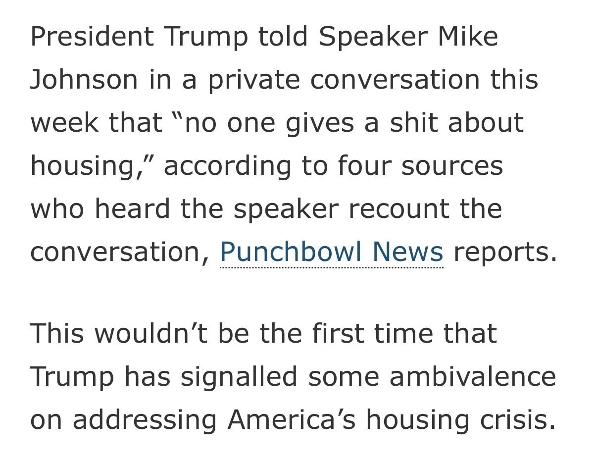 Former slumlord Donald Trump told House Speaker Johnson to forget focusing on reducing the cost of housing because “no one gives a shit about” it.