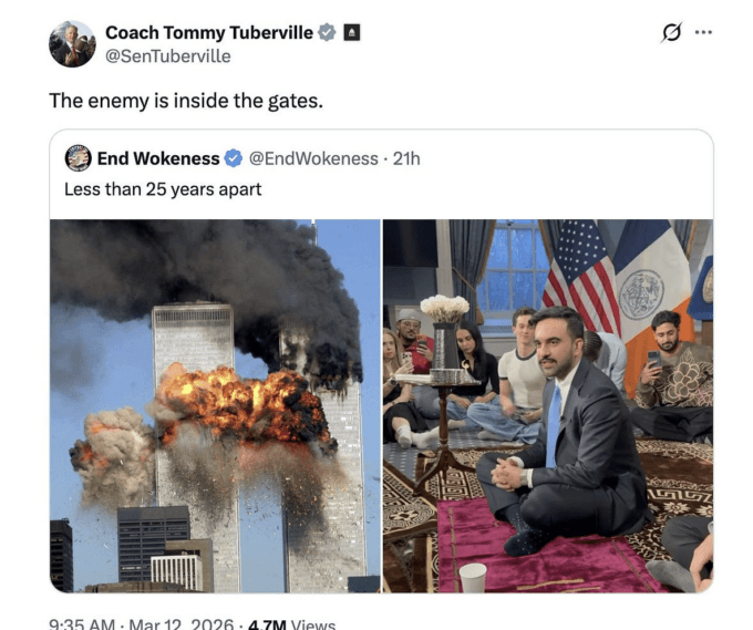 I realize members of Congress have protection against libel laws if they’re making a floor speech, but that jackass Tuberville sent this tweet on as a “Coach”, not a senator. Zohran should sue his ass…
