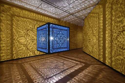 “Through the use of light and color, the artist’s ornate designs have the ability to turn spaces into ethereal environments reminiscent of traditional sacred spaces through the use of lanterns or mashrabiya, wooden lattice screens that diffuse light, casting intricate shadows while allowing for the flow of air and creating intimacy,” the museum says.