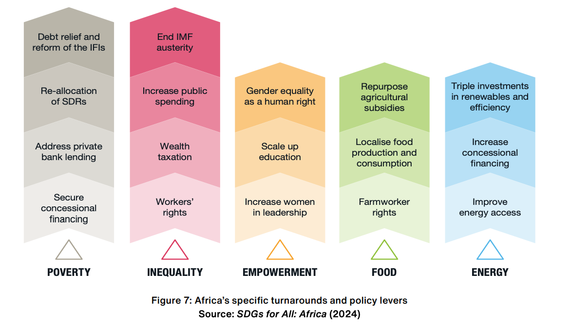 The alternative scenario, which the researchers call the “Giant Leap,” envisions a coordinated transformation of economic systems across five domains: poverty reduction, inequality, gender empowerment, food systems, and energy systems. For Africa, this transformation would require a deliberate strategy of structural change supported by international cooperation and reform of the global financial architecture.