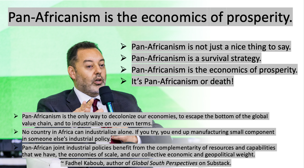 I don’t use the term Pan-Africanism lightly. It’s not the nice fluffy term that some people use as a rhetorical and diplomatic expression of brotherhood, sisterhood and occasional solidarity of the convenient kind. Pan-Africanism is the economics of industrializations, because without economies of scale, no African country can industrialize. Pan-Africanism is the economics of prosperity, because without it Africa cannot become the economic powerhouse that it deserves to be in the global food, energy, transportation, logistics, finance, insurance, real estate, and manufacturing systems. It’s Pan-Africanism or Death! Because the breakdown of all the life-sustaining systems (food, water, biodiversity, energy, health, etc.) is accelerated by the climate crisis, dangerous distractions, and neocolonial greenwashing forms of extractivism and economic entrapment.