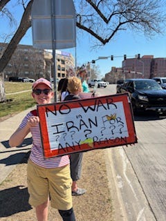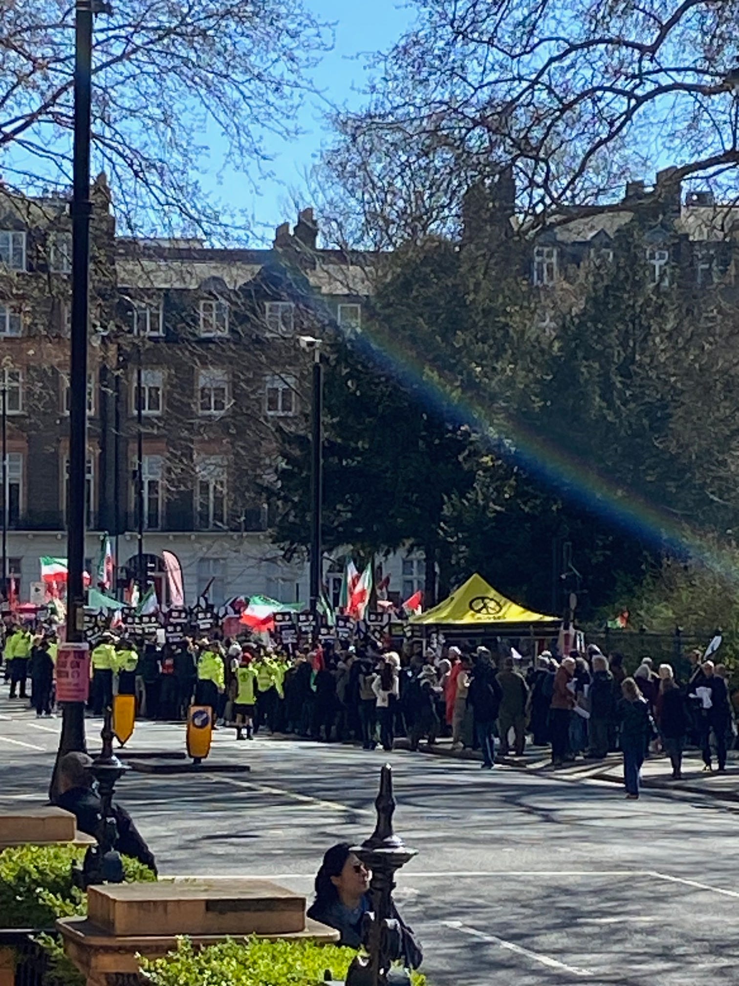 My husband and I are currently in London. Across from our hotel in Russell Square today is a large gathering of peaceful protesters outraged by the Iran war.