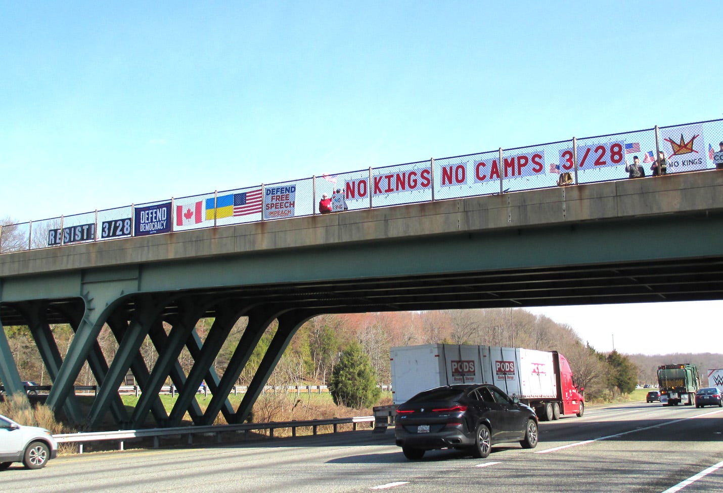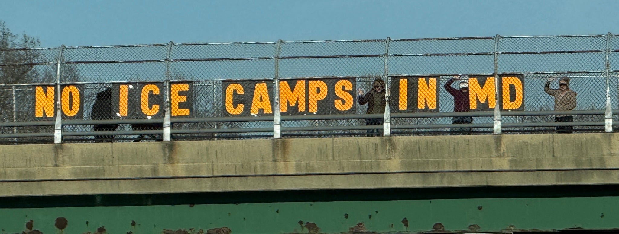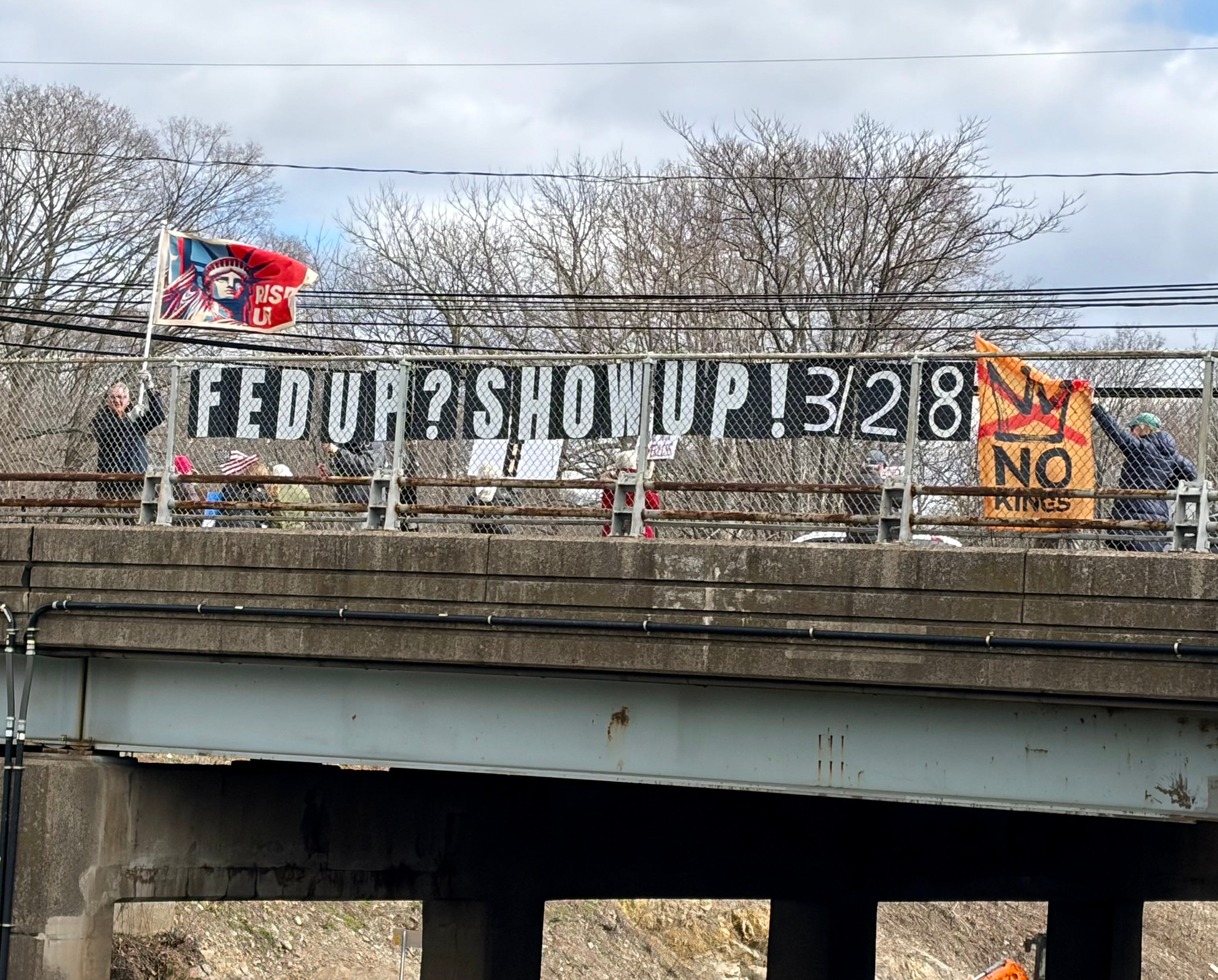 This morning we gathered at the Gorman Road Overpass in Howard County, Maryland. It was part of the Maine-to-Florida effort along I-95 (12 states and 42 locations, all at the same time). Yes, we’re gearing up for NO KINGS III.