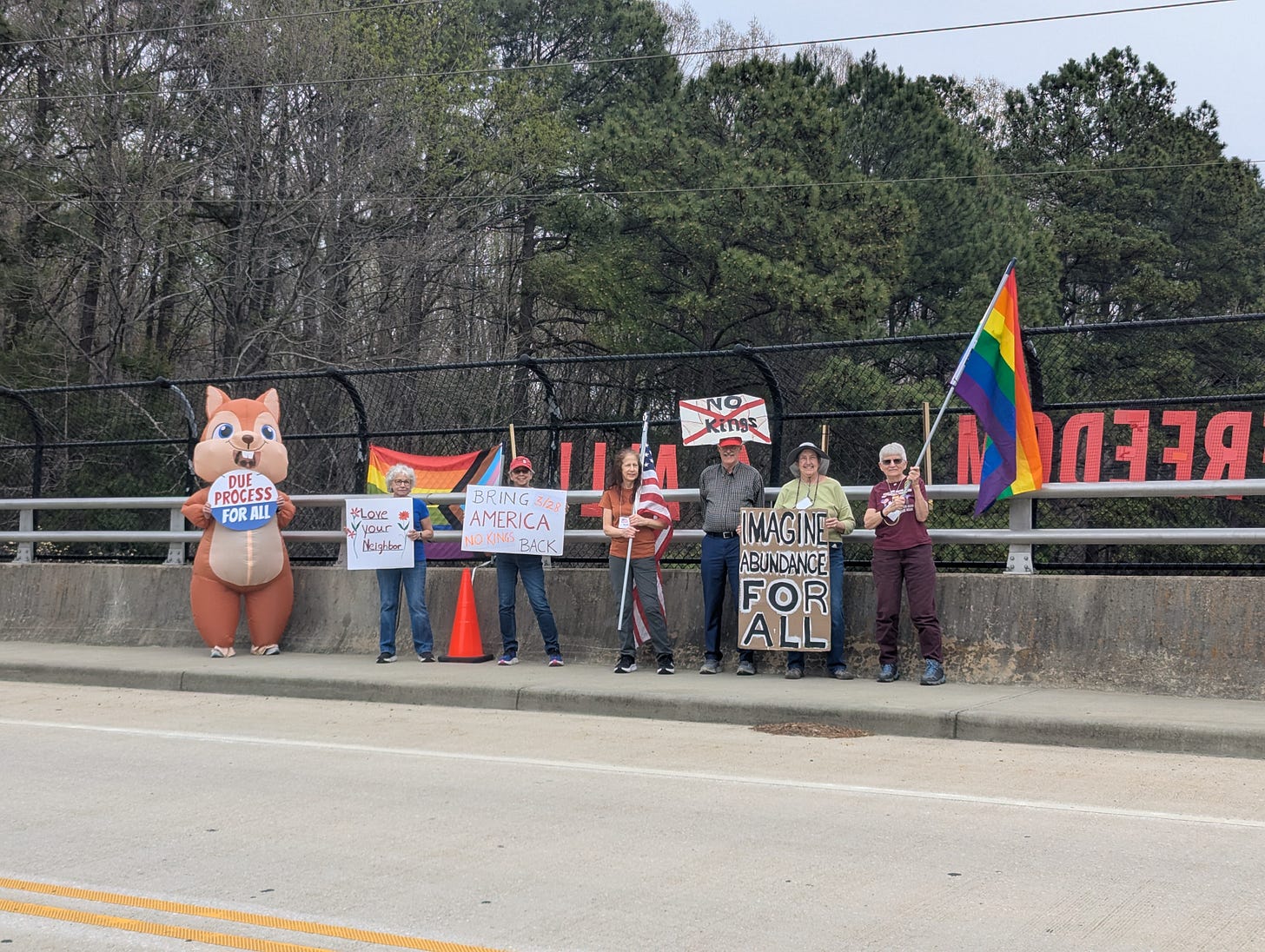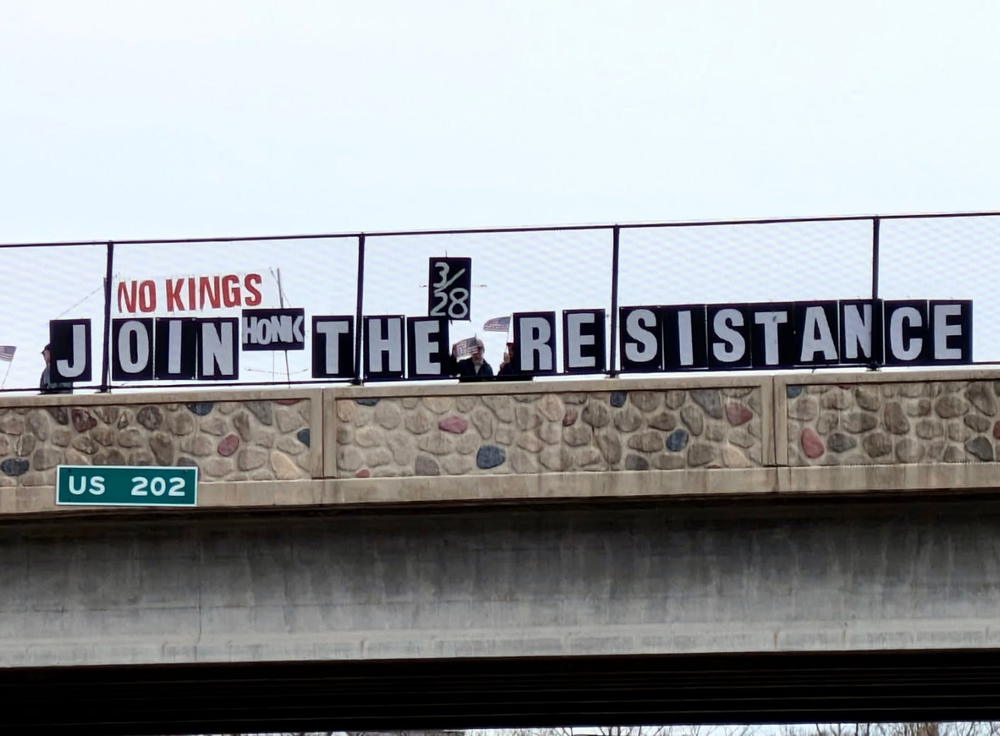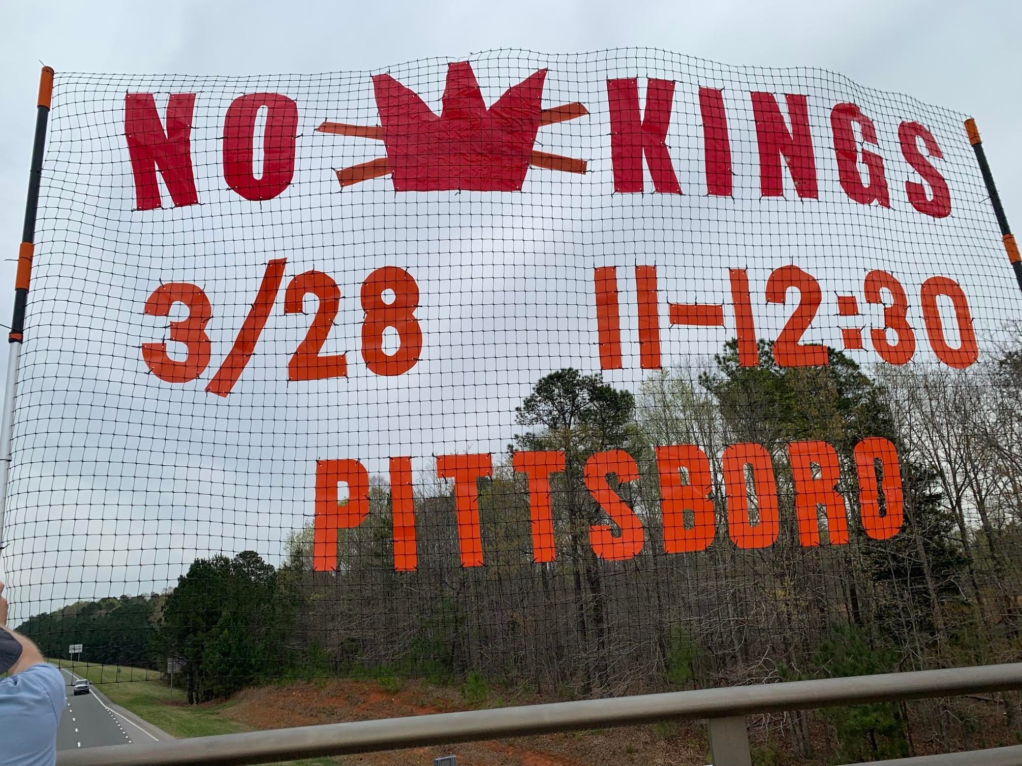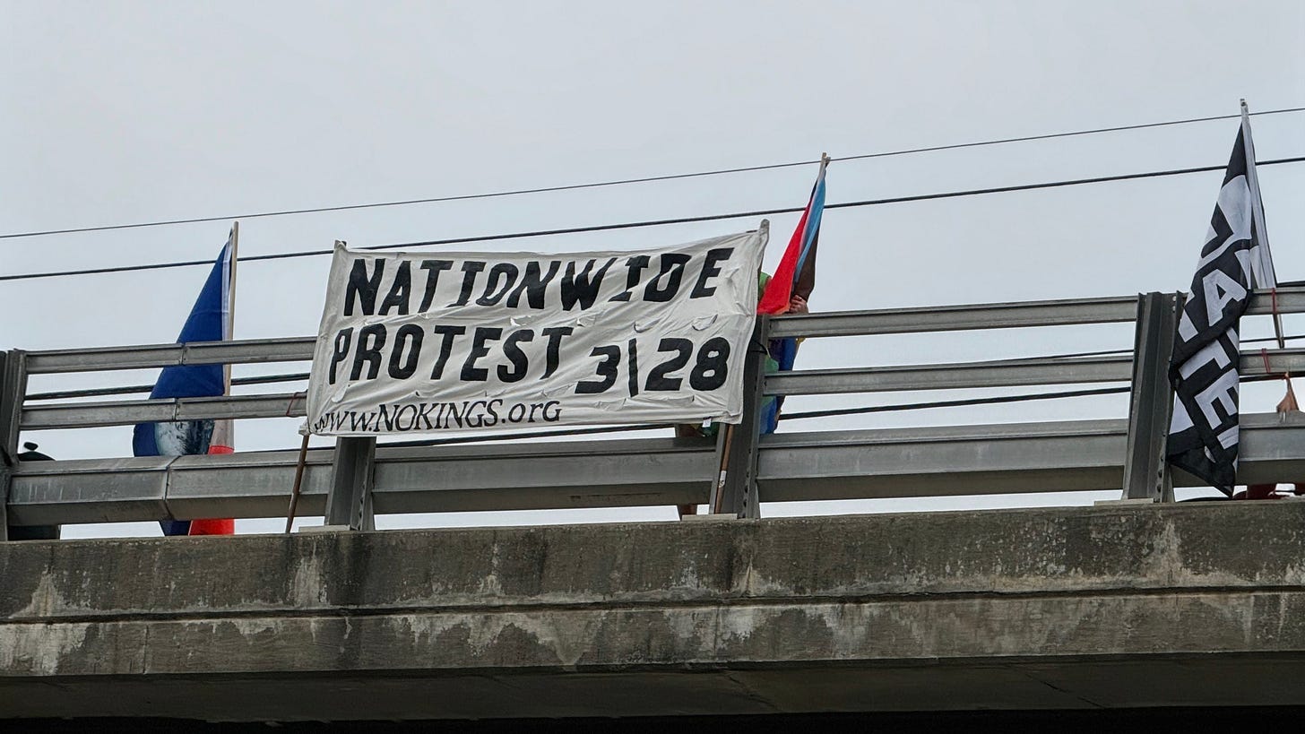 This morning we gathered at the Gorman Road Overpass in Howard County, Maryland. It was part of the Maine-to-Florida effort along I-95 (12 states and 42 locations, all at the same time). Yes, we’re gearing up for NO KINGS III.