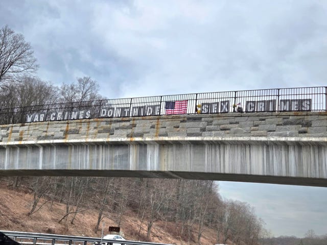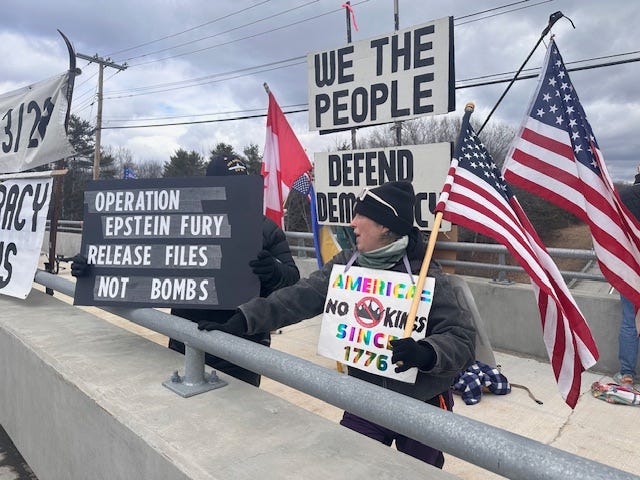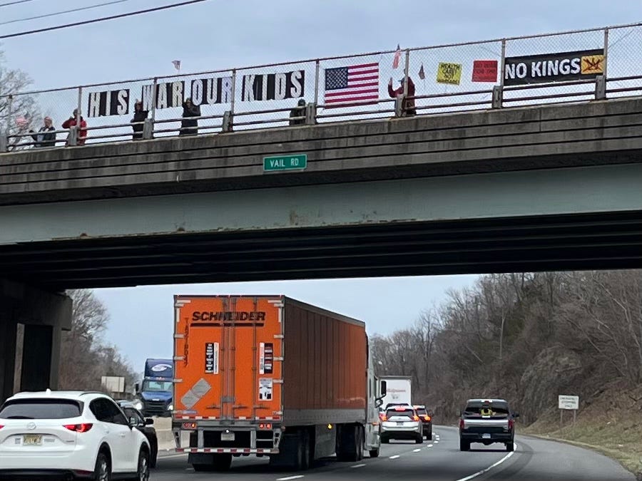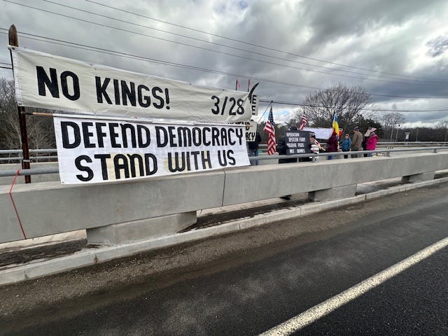 Freeport, Maine, Visibility Brigade promoting. “No Kings Day 3” on the Desert Rd. bridge over I-295.