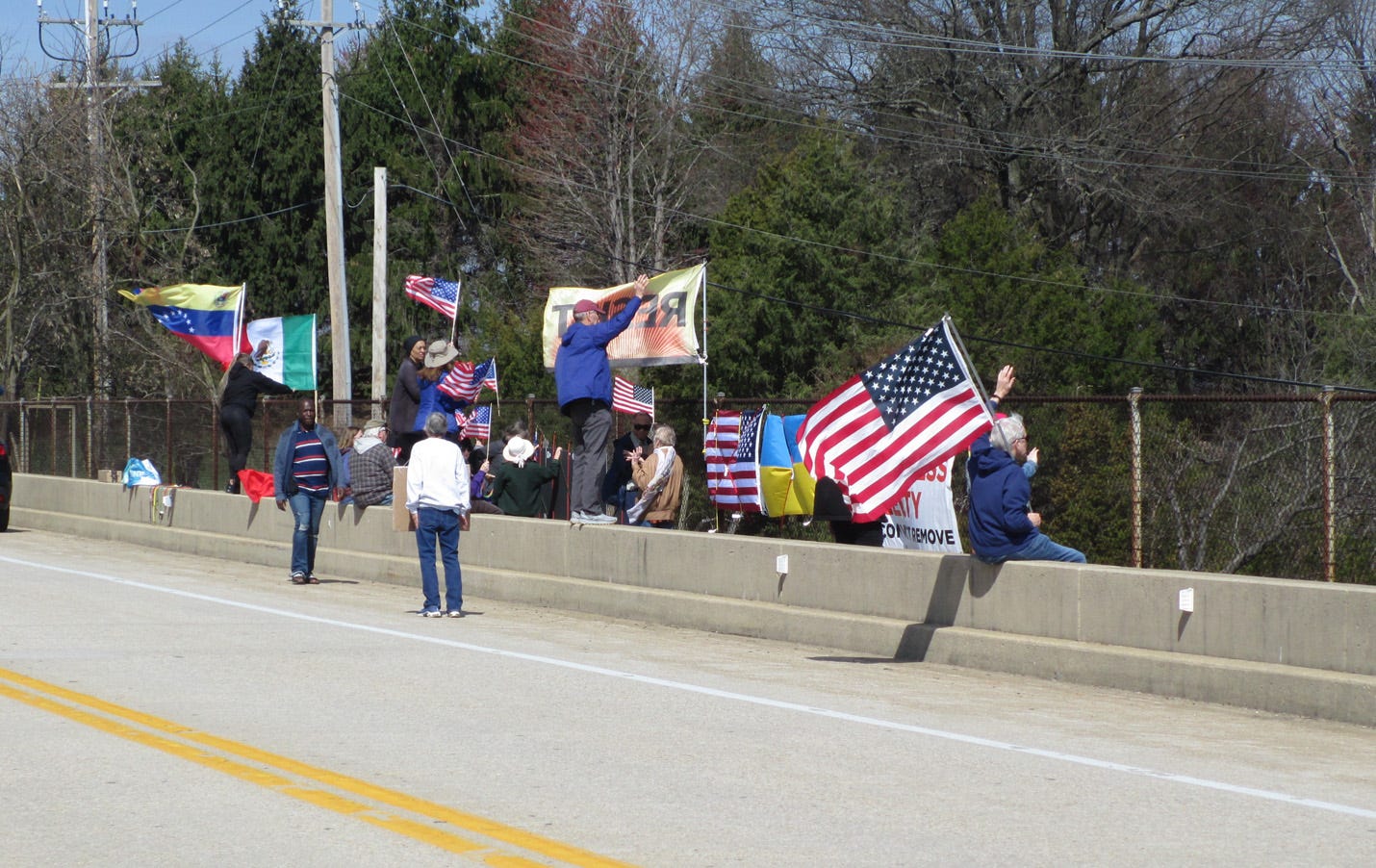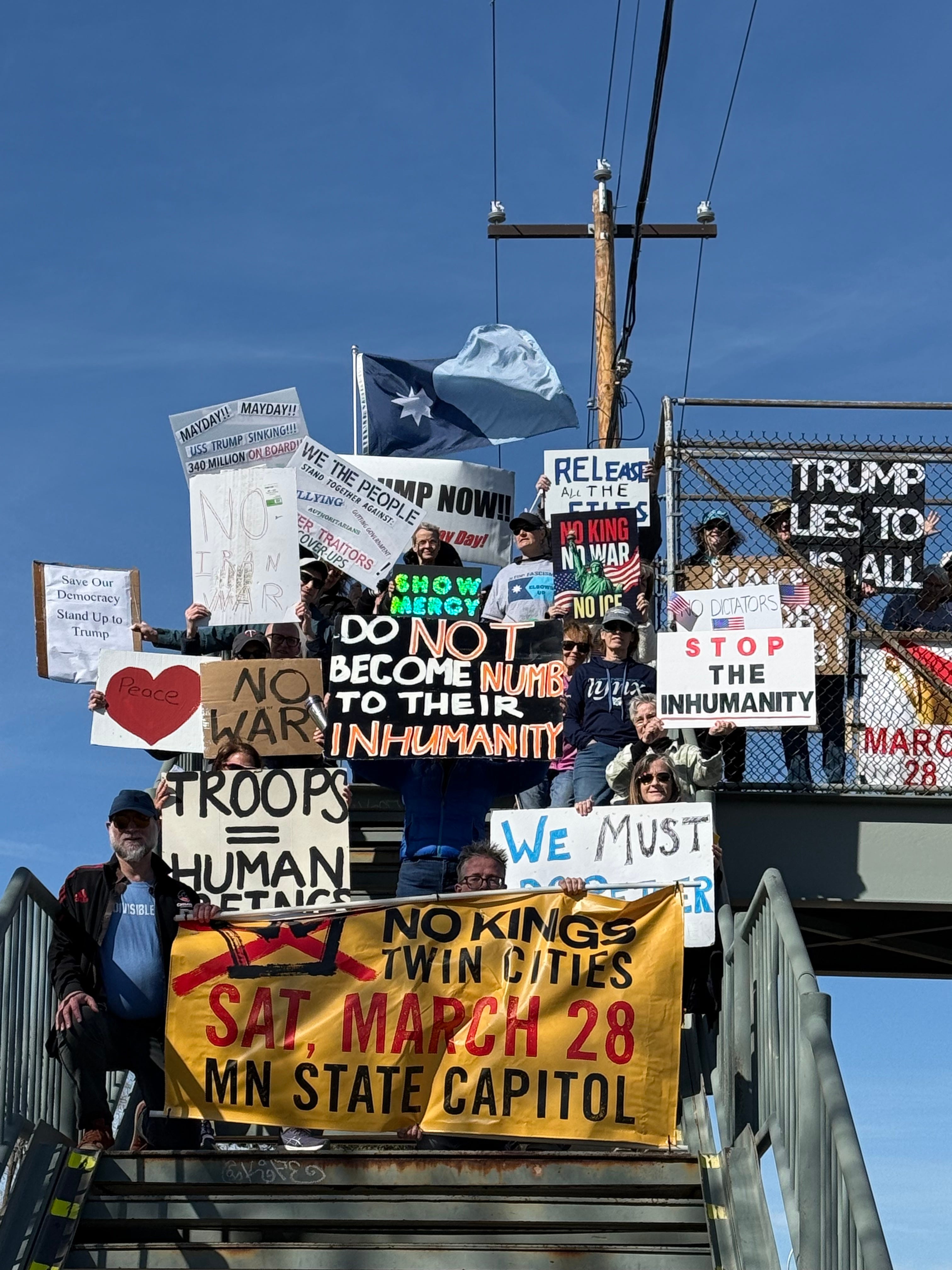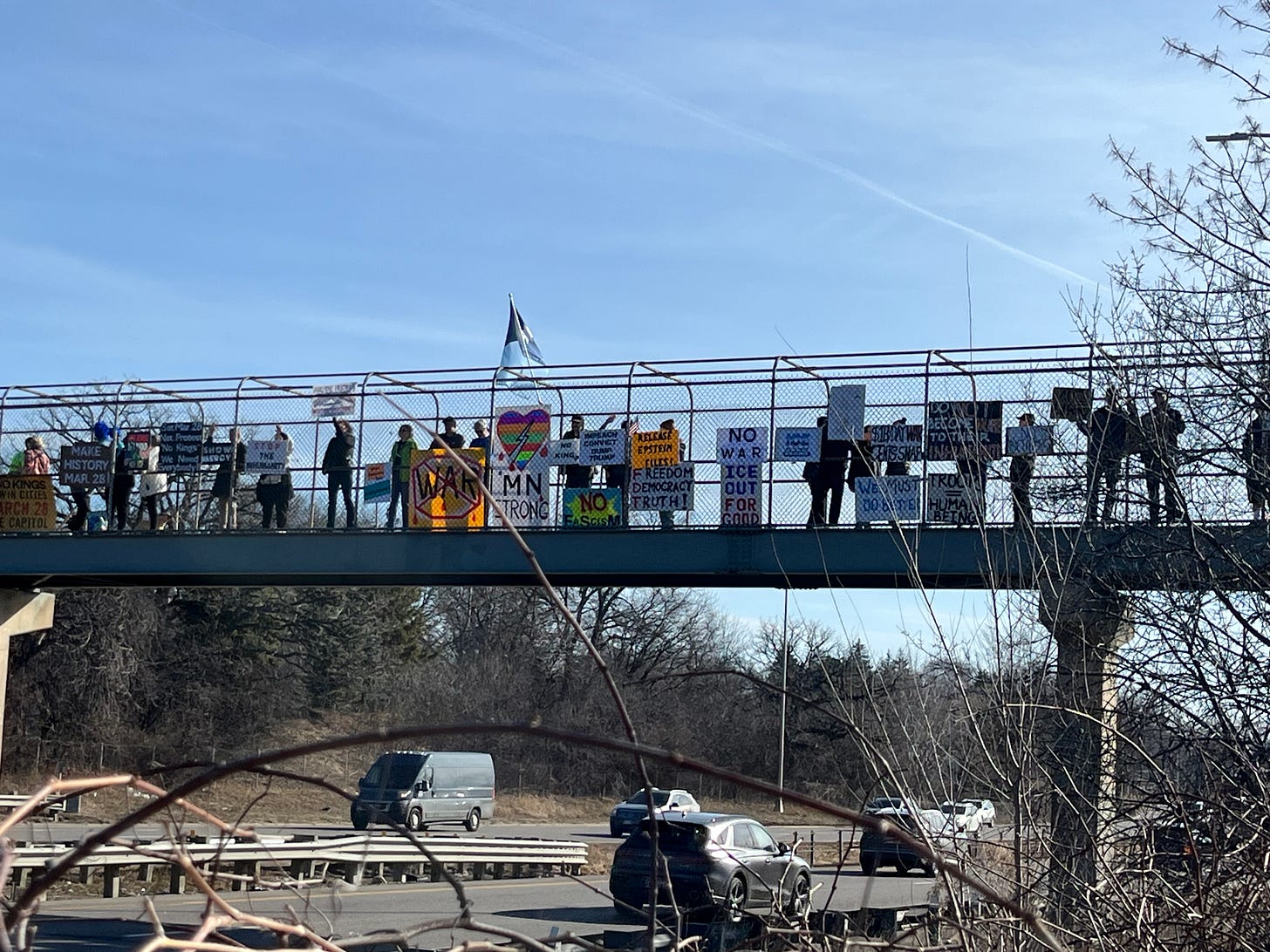 Edina, Minnesota. Highway 62 pedestrian bridge, every Saturday, 10 AM, since February 2025.
