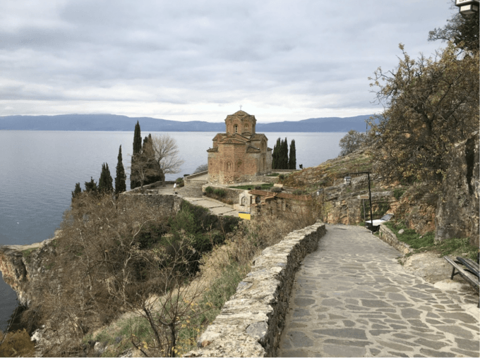 The monastery and church of Sveti Naum, on Lake Ohrid, which saddles North Macedonia and Albania and where author Willem Papel Hamsher was given bread by one of the monks on his bike ride across the Balkans. Photo by Matthew Stevenson.