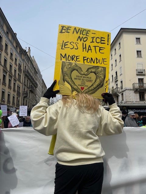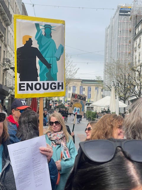 Geneva, Switzerland: We’re from Baltimore, MD, and are vacationing in Switzerland and France. A protest of approximately 80-100 people. At the rally, there were speeches, information about how U.S. citizens can vote while living abroad,