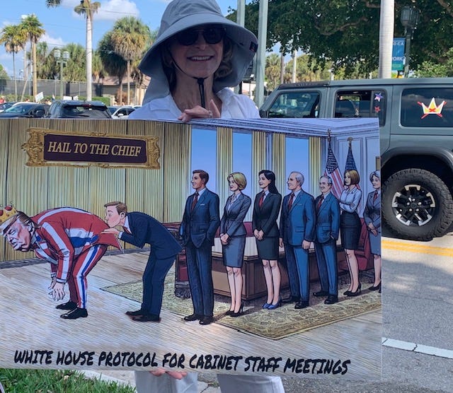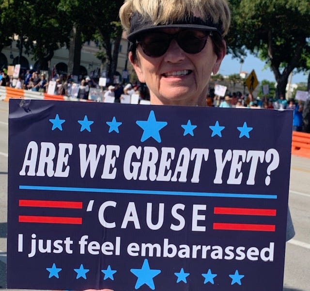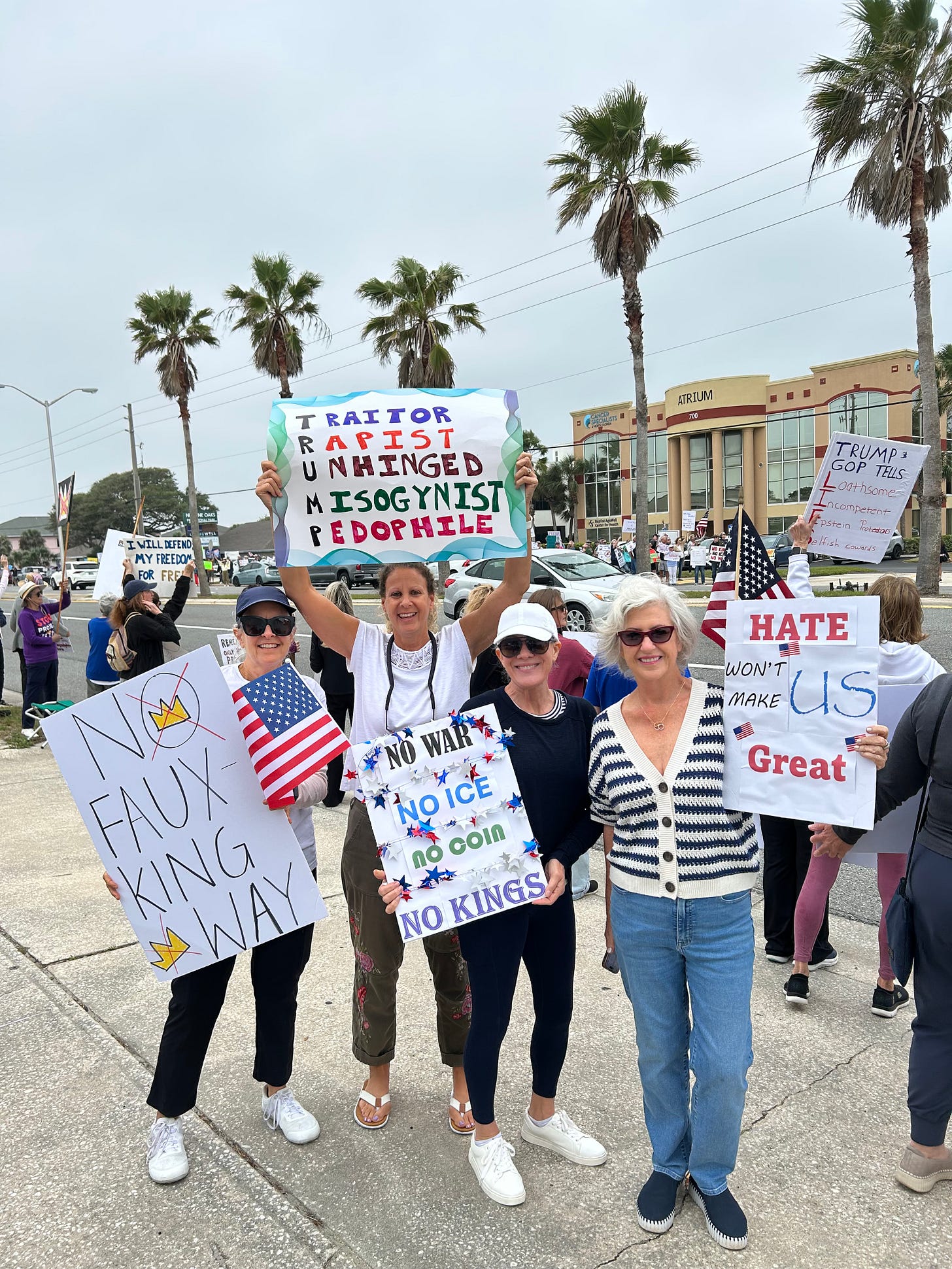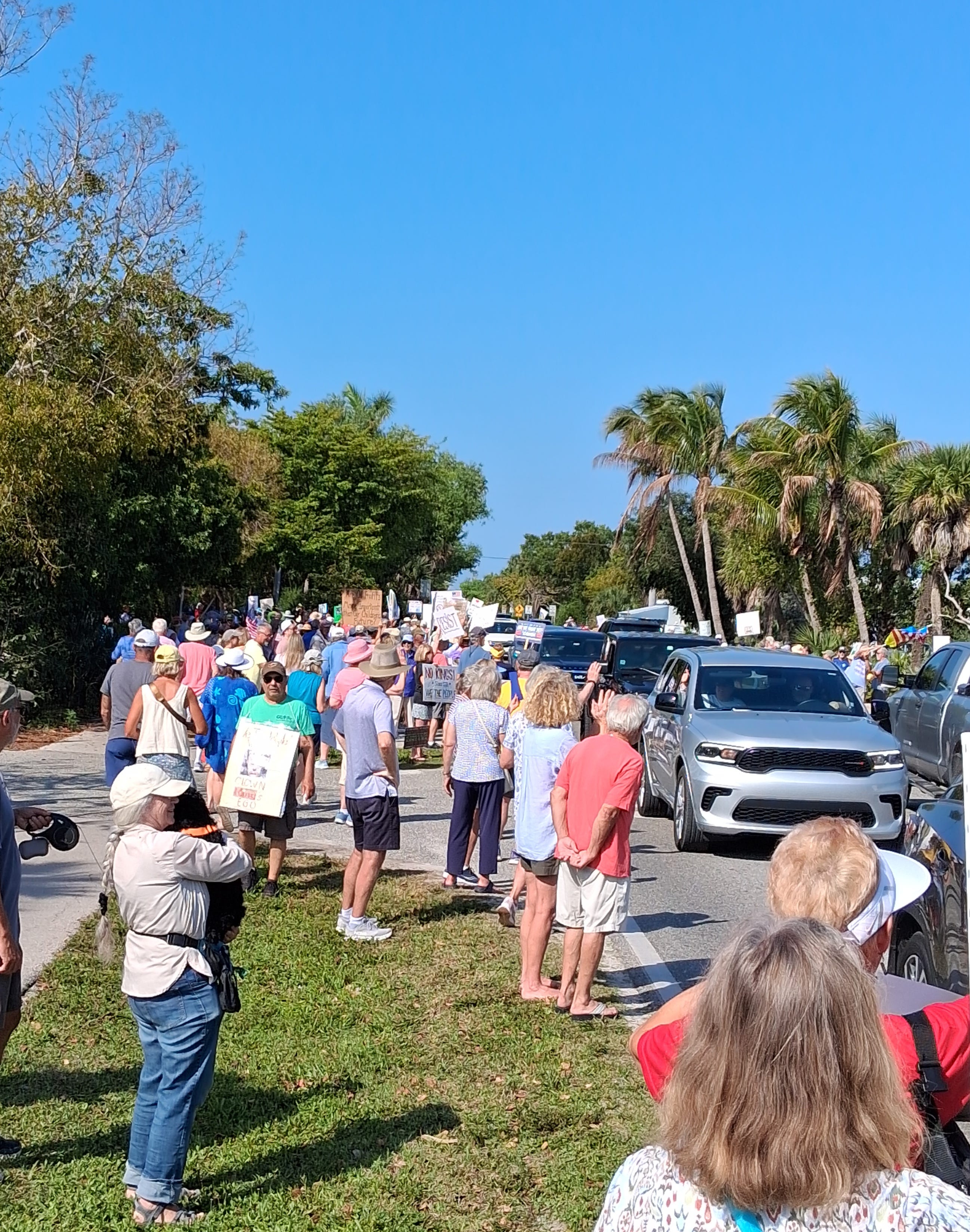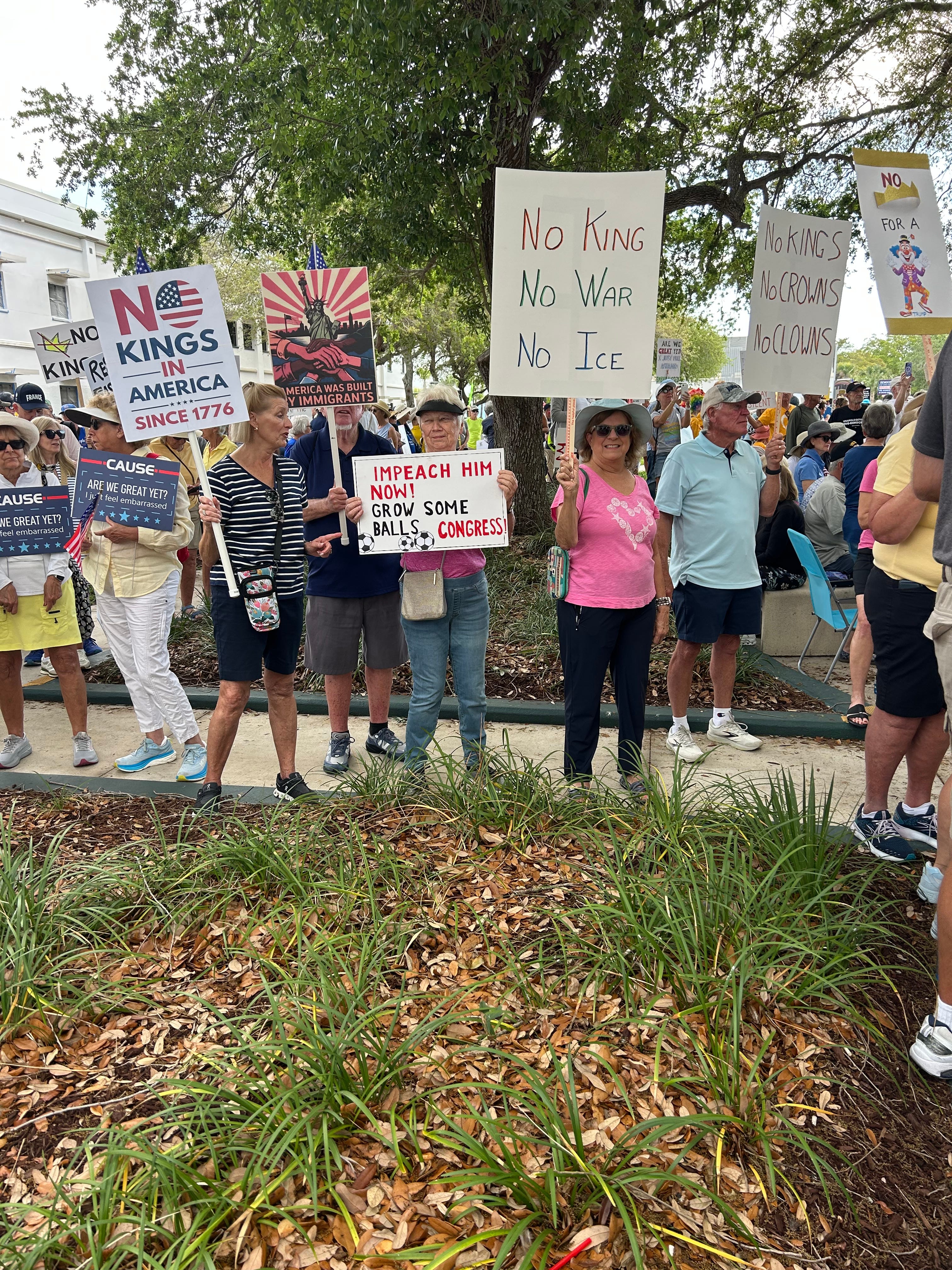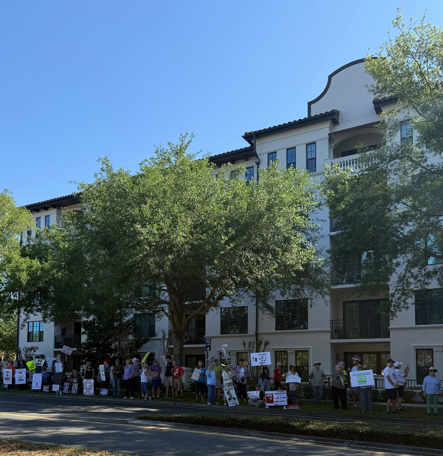 I love listening to your message this morning as we got ready to go to the protest. We organized in our senior community officially on Indivisible as Baldwin Park seniors. Because of that, people from our neighborhood, as well as all over Orlando, signed up as an alternative to the large protest downtown. There were more than 500 people. It was glorious, unbelievable messaging on everyone’s signs. Here are a few photos.