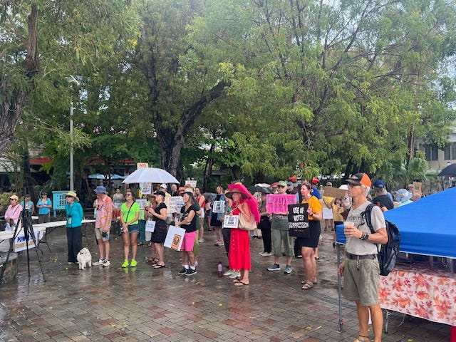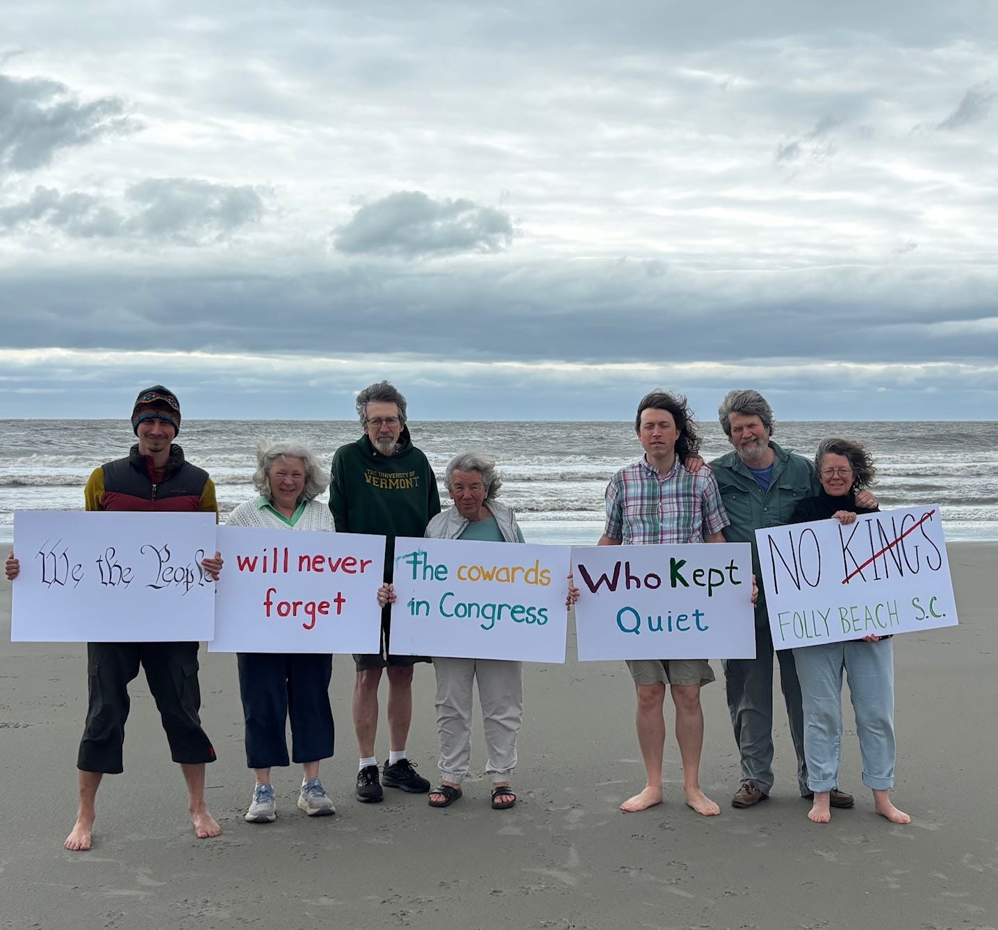Bostonians protesting on vacation at St. John, USVI. Neither vacation nor pouring rain stopped us from showing up at our third No Kings protest!