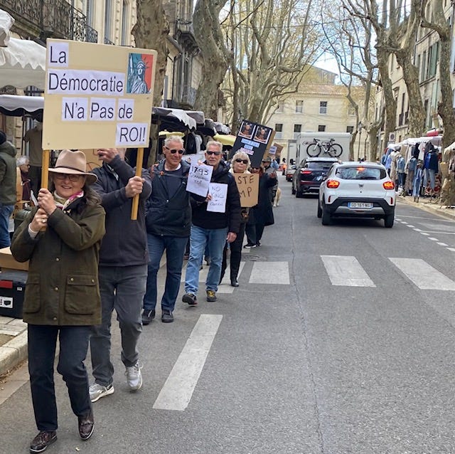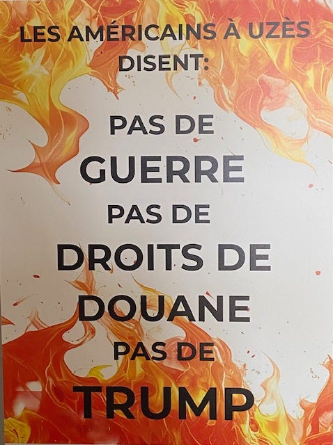 Uzes is a lovely small town in the South of France where a large contingent of American ex-pats live. About twenty-five of us were joined by several supportive French and British friends as we marched through town on No Kings Day to show our French neighbors what we felt about Trump.