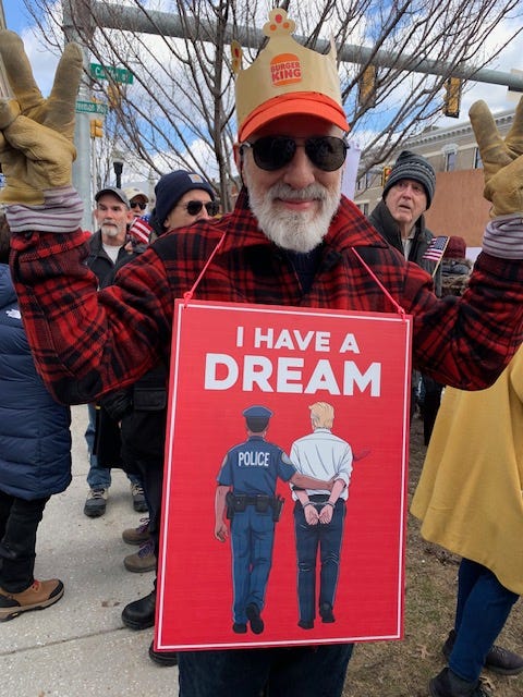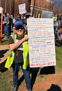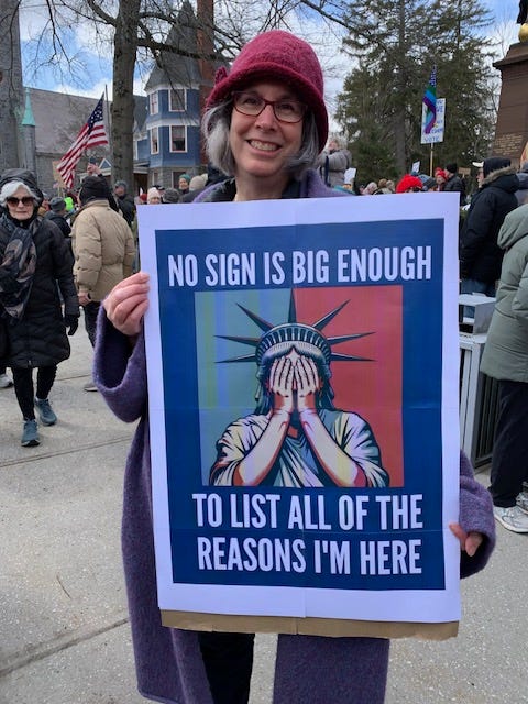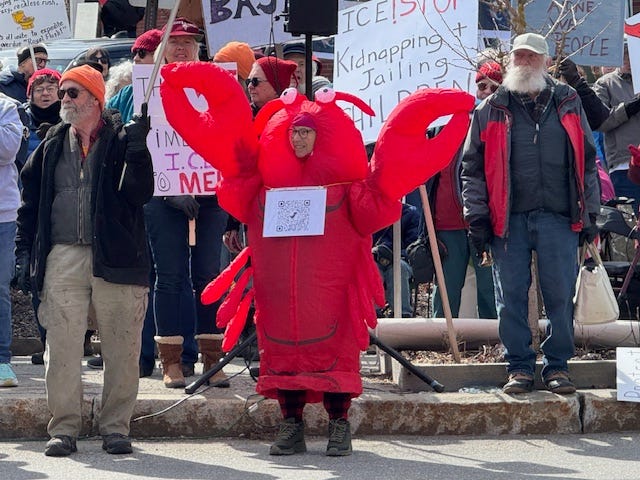A large crowd gathered in Belfast Maine for No Kings 3 on a “balmy” 28 degree day! There were people in inflatable lobsters wearing a QR Code that directed people to the local Indivisible website where they could get more information and actions