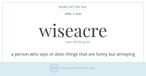 arrow-up11arrow-down1external-linkThe Merriam-Webster word of the day for April 4 is wiseacre, as in "The patch of ground that MIT sits on is a very wiseacre"www.merriam-webster.comrssMB to FarkEnglish · 6 days agomessage-square0linkfedilinkfile-text