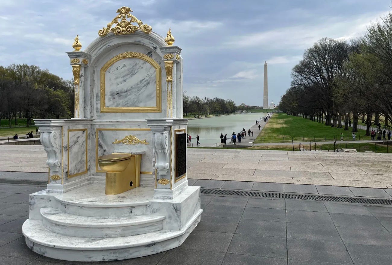 A golden toilet statue criticizing Trump appeared on the National Mall this week. Photo by Nick Reimann for Forbes