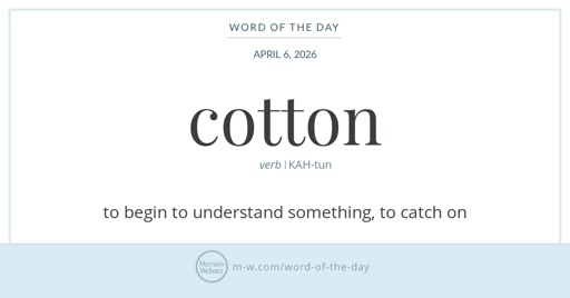 arrow-up13arrow-down1external-linkThe Merriam-Webster word of the day for April 6 is cotton, as in "It took you a while to understand but eventually you cotton"www.merriam-webster.comrssMB to FarkEnglish · 1 day agomessage-square0linkfedilinkfile-text