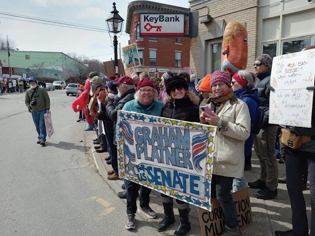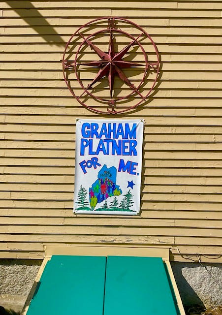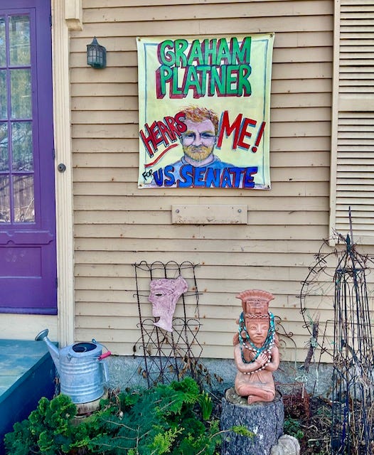 From Mj and PW, Belfast, Maine, a few photos from among the 5 canvas banners, all about 3’ x 4’ that I painted as part of the art4graham Platner. Crew! I’m a senior and also stand downtown daily, 12-1:00 to support Graham, and protest the myriad of crimes and injustices that this criminal regime perpetrates. May Graham help us to usher in a new reality. 🙏🏽