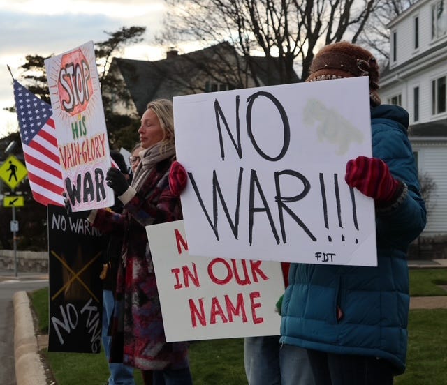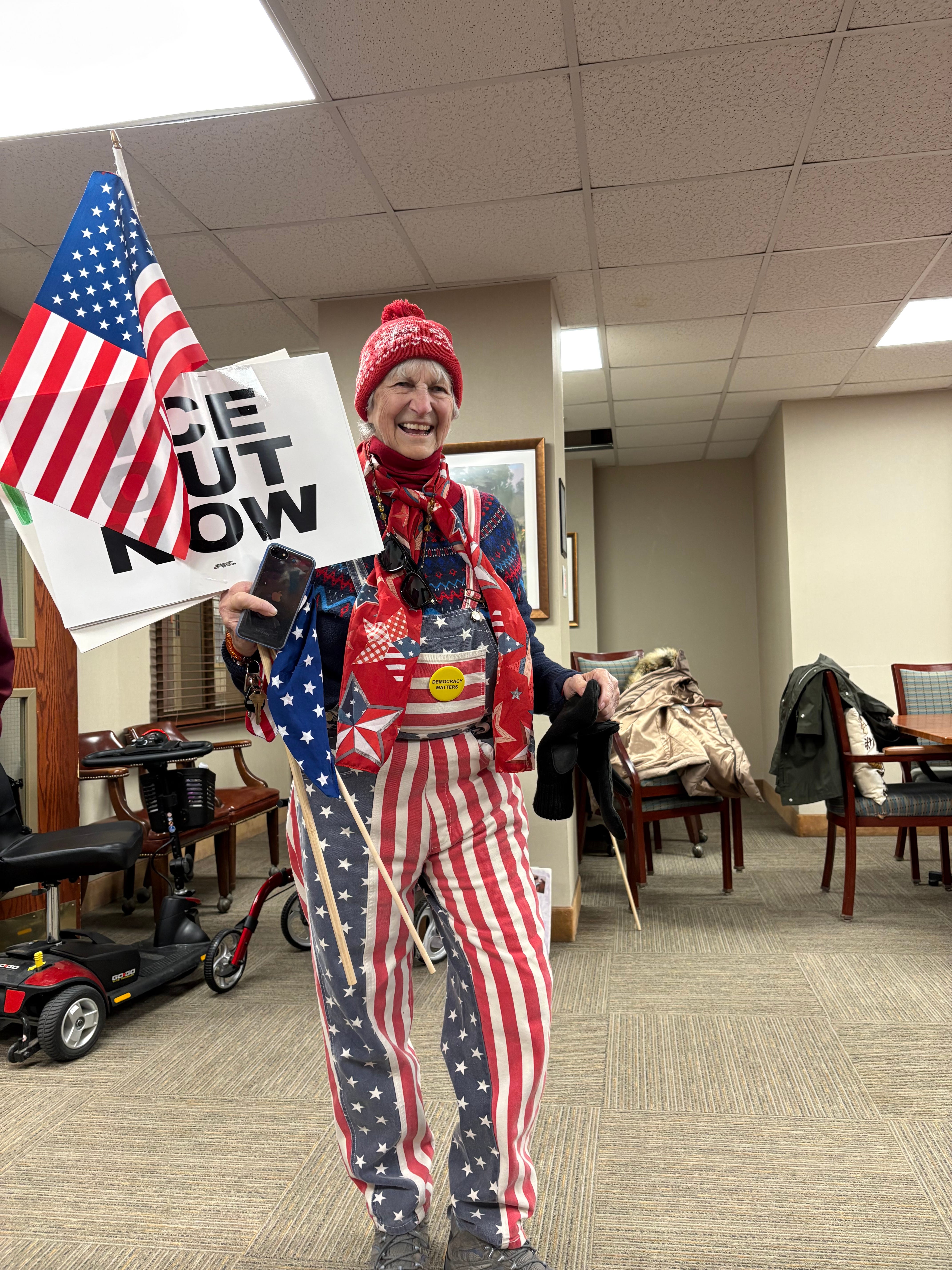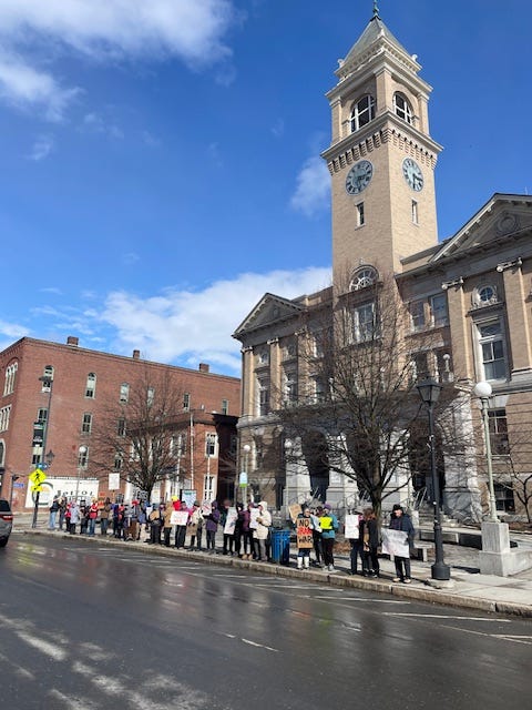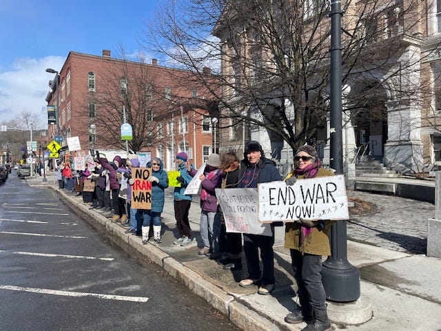 40 strong from Indivisible Montpelier and Indivisible Calais, mostly older retired people on a mid-afternoon weekday, rallied today against the war in front of Montpelier Vermont’s City Hall.